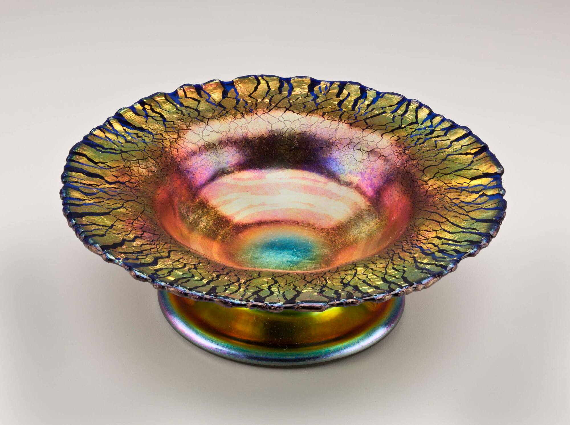 This bowl is an example of Tiffany’s Favrile glass. In 1894, Tiffany patented his iridescent glass under the name Favrile. The word Favrile is derived from the Old English fabrile, meaning hand-wrought. Inspired by glass from ancient Rome and the Islamic world, Venice and Bohemia, Tiffany glassmakers copied many of the colors, texture, decoration and unique forms made long ago. Tiffany combined his talent as a colorist, naturalist, and designer with his experimentations on blown glass surfaces. Vessels were fumed with metallic oxides before firing to achieve the same iridescence found on ancient glass. To see an example of ancient glass in the Johnson Museum’s collection, search for object number 57.109 in the keyword search box.