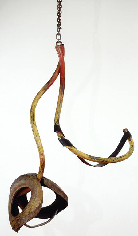 Just as Abstract Expressionist painters explored the idea of gesture by using unconventional tools to shape the creation of a painting, Mark di Suvero incorporates the idea of gesture into his sculpture through the scale of his work as well as his use of found materials. Once describing his own work as “painting in three dimensions,” his monumental sculptures often incorporate improvisation, tension, and balance. Di Suvero’s sculpture is strongly influenced by his association with the world of machine shops, garages, and boatyards. Constructing his work at garages or other sites where machinery was made and repaired, di Suvero uses such commonplace elements as rubber tires and chains. These materials contribute to an unpretentious sense of fun and down-to-earth grit. As in his other large scale sculptures, di Suvero paid careful attention here to composition, balance of forms, and capacity for movement, intending the sculpture to be viewed from a variety of angles and positions.