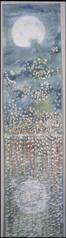 Through surface patterns of dotted and dabbed colors, Chen Chi-kwan captures the cool light of the full moon, and the shimmering harbor lights and their watery reflections on a foggy night. This painting was completed shortly after Chen settled in Taiwan. Born in Beijing, Chen received a traditional education in the Chinese classics and calligraphy, but his family’s life was interrupted by the turmoil of the Japanese occupation and they moved many times. After serving during World War II, Chen left for the US to earn a master’s degree in architecture from the University of Illinois and then studied art at UCLA. He was hired by the Bauhaus architect Walter Gropius to work in his architectural firm and later briefly taught architecture at MIT until he was invited by I. M. Pei to join him in designing buildings for the campus of Tunghai University, Taiwan. Chen employed his architectural aesthetics in imaginative ways in his paintings and enjoyed a successful career both as architect and artist. (“Moon,” curated by Ellen Avril and presented at the Johnson Museum August 25, 2018-January 13, 2019)