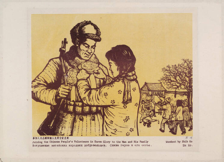 Woodblock on paper; sepia on a yellow background