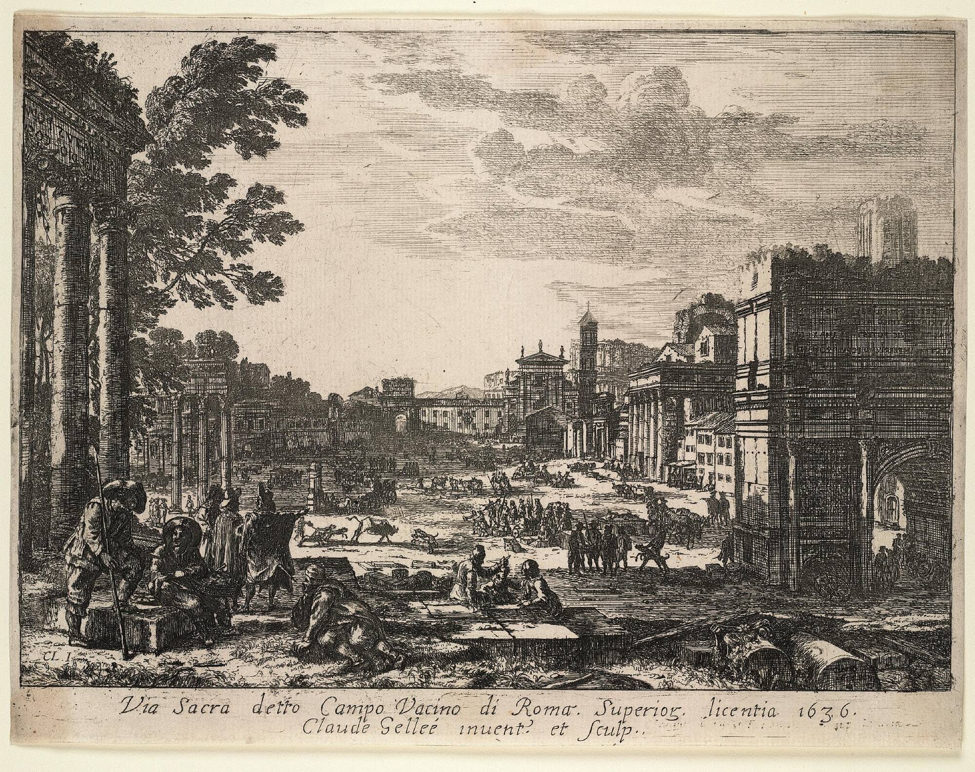 This relatively early view by one of the greatest French artists at work in Rome in the seventeenth century is very similar to Lorrain’s 1636 painting in the Louvre, which depicts all the major monuments of the Forum without singling any out for particular emphasis. The Colosseum, for example, is just barely visible in the far background, behind the church of Santa Francesca Romana. The profusion of figures—human and animal—on the Campo Vaccino, or “cow field,” a name derived from the cattle pastured there among the ruins— underscores the largely lawless state of the city at this time. In the foreground, soldiers of uncertain affiliation converse, while in the middle ground a group is engaged in the questionable practice of wagering on a bout of bull baiting. Claude’s apparently careless reversal of the scene, which attests to having been copied from the painting directly onto the plate, results in a mirrored composition when printed. Thus, the Arch of Septimius Severus, which should be on the left, is seen at right. This kind of reversal would be anathema to those artists at work in the heyday of the veduta a century later, who were concerned above all with presenting legible topographical views of the city.