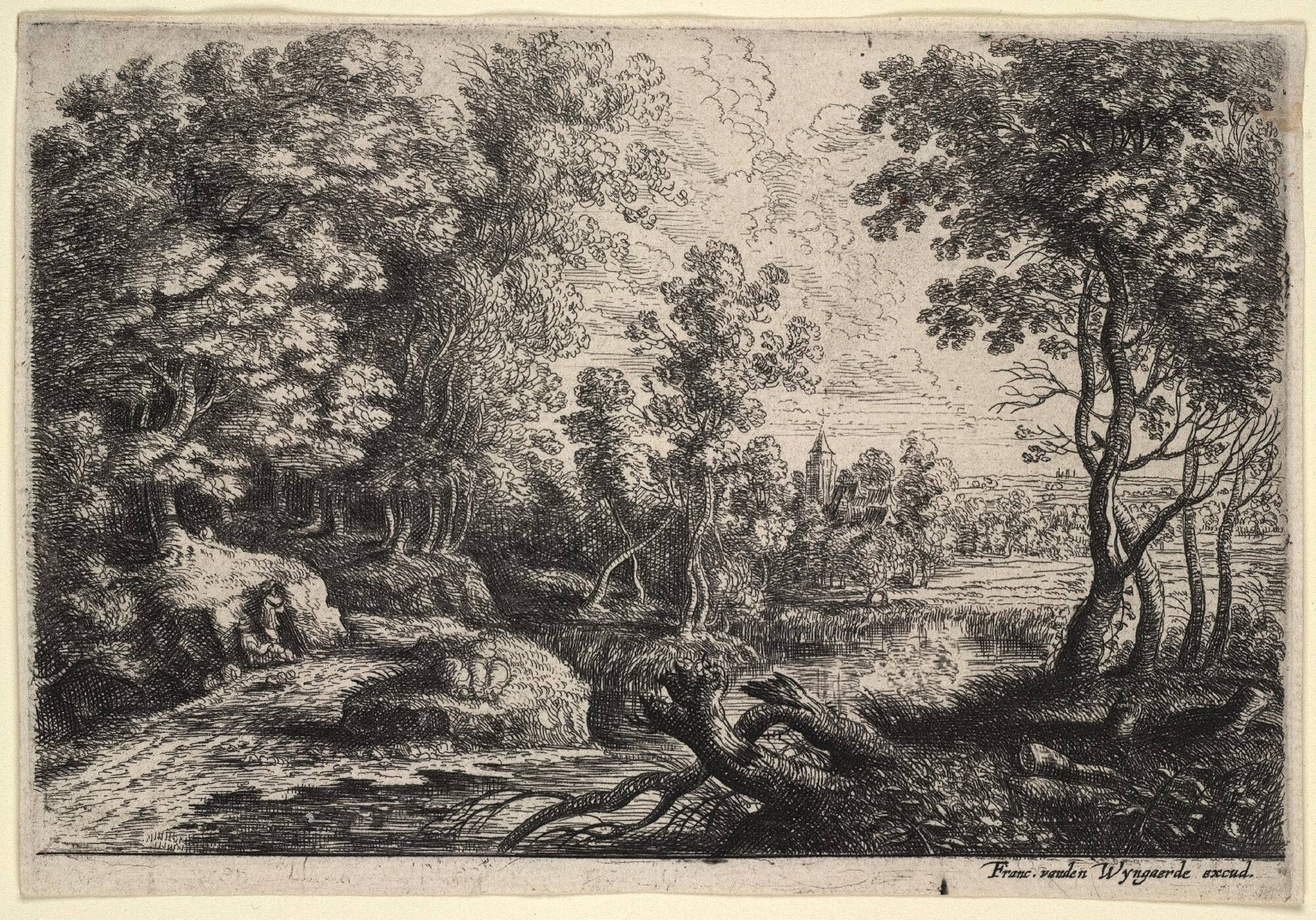 Landscape, with 2 Figures resting at left, distant landscape through four trees at right