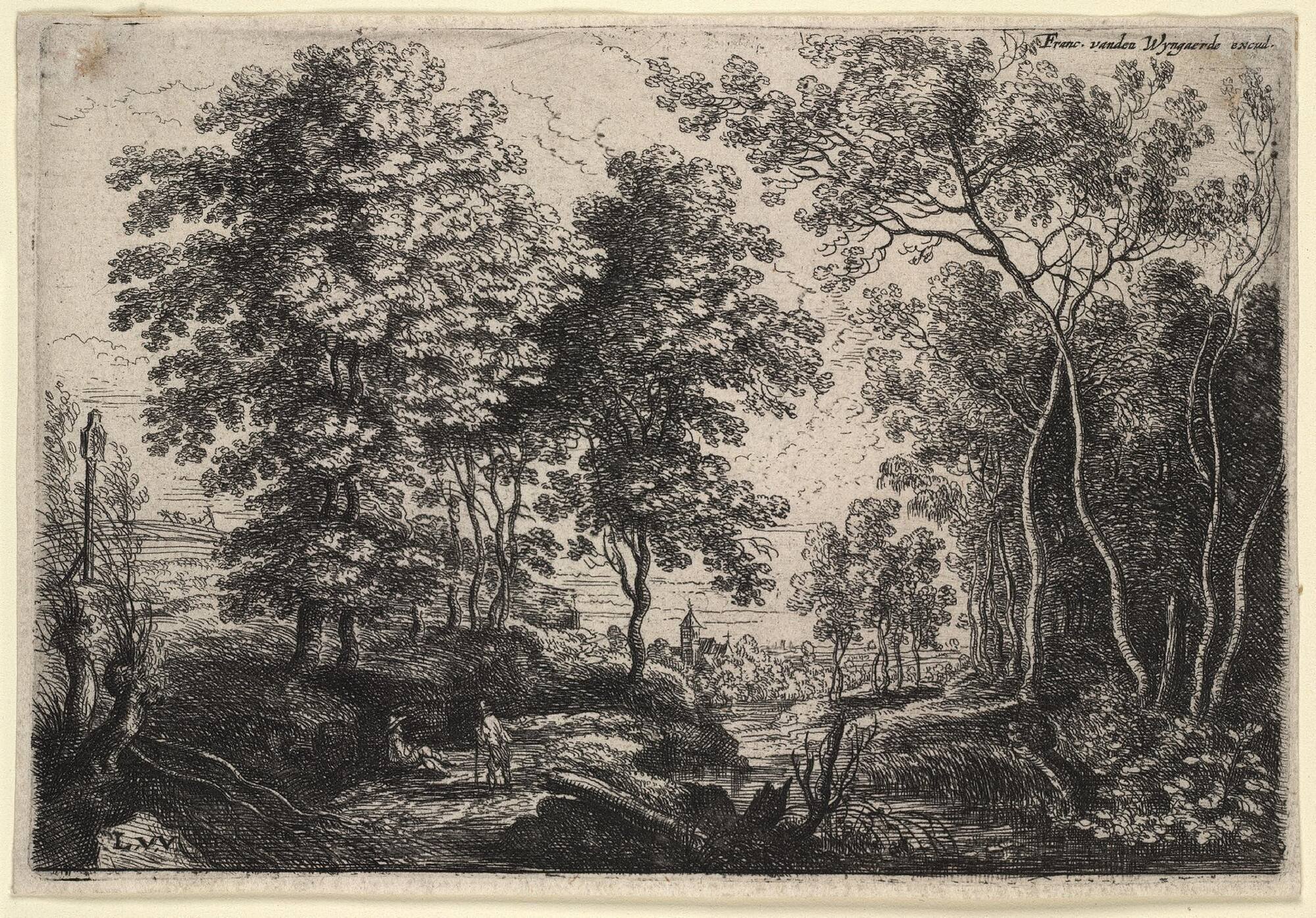 Landscape, with 2 Figures resting at left, distant field being ploughed at far left
