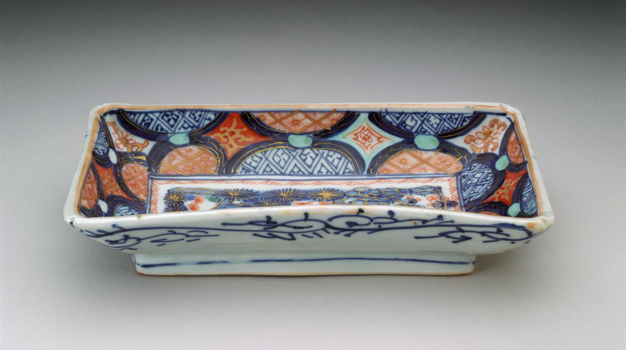 Porcelain with underglaze cobalt blue, and overglaze enamels in red, green, and gold