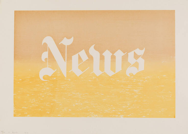 In 1969, Ruscha published Stains, a portfolio of seventy-five sheets literally stained with common household substances, housed in a black case with the title in silver lettering and Gothic script. One year later, he employed a similar conceit in terms of both typeface and materials in the portfolio News, Mews, Pews, Brews, Stews & Dues.Working with Alecto Studios in London, Ruscha selected rhyming words that “sounded British to me,” and printed a series of “organic” screenprints with inks made from commercially available foodstuffs, local flowers and fruits, and even axle grease. Reading like a grocery list, a roster of ingredients that make up each “dye” include brand names of the companies that produced them, underscoring the capitalist structure that governs consumerism of all substances, including seemingly natural ones. The muted hues (rhyme fully intended) at first appear to have faded from light exposure, yet the varying levels of saturation produced by the unpredictable inks are actually a palpable reminder of the artist’s conceptual experimentation, which can at times fly in the face of museum conservation concerns. (“All for One and One for All: Portfolios from the Permanent Collection,” co-curated by Andrea Inselmann and Sonja Gandert and presented at the Johnson Museum June 24-August 20, 2017)
