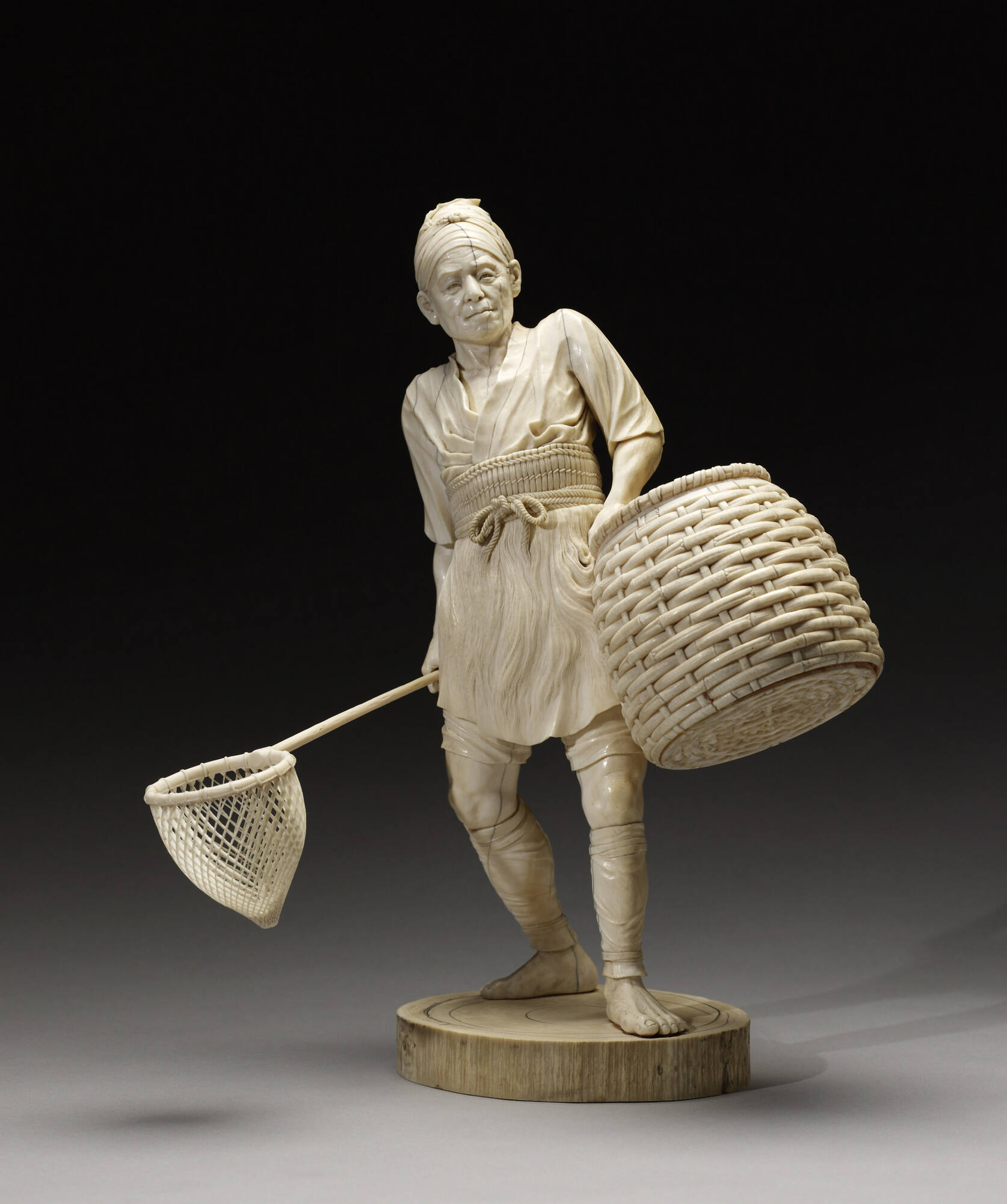 After the Meiji Restoration (1868), many traditional artisans lost their patrons and were forced to re-shape their artistic activities in order to adjust to Western concepts of art that began to affect late nineteenth-century Japanese aesthetics. Among the most popular new artisans in the Meiji era were the ivory carvers. Large ivory carving quickly developed in the 1880s and lasted for about a decade. Especially welcomed by foreigners, Meiji ivory sculpture became the most popular Japanese craft at the world expositions as well as in the Western market. This particular piece was most likely an export object made in response to these new demands. The fisherman with basket depicted here is a typical example of Meiji period hyperrealism, as witness the very subtle expression on the face and the clearly tense musculature of the body. The Meiji artists used their highly skilled techniques to simulate the texture of real objects: a slab of wood, the net, baskets, robes, and reed-plaited outer wrapping. The fisherman is carved from a single large block of ivory, while the basket, fishnet, and base are separately carved and added. (From “A Handbook of the Collection: Herbert F. Johnson Museum of Art,” 1998)