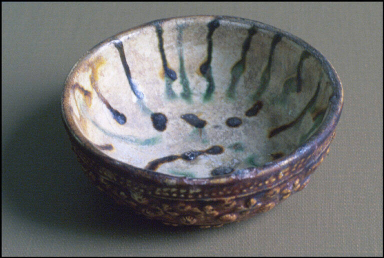 Earthenware with lead glazes, carmel brown on the outside, brown, yellow-brown and green on the inside.