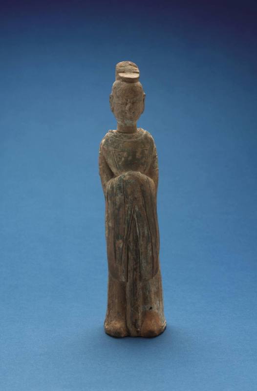 BRIEF DESCRIPTIONThis clay figure is called a mingqi and was placed in a tomb to serve the soul of the deceased.WHEN WAS IT MADE?It was made during the reign of the Sui dynasty (581-618). Though short-lived, this period was important for the re-unification of north and south China, for centralizing the government, re-introducing the civil service system (including the creation of the jinshi degree) and for adopting a new code of law that served as a prototype for the subsequent Tang dynasty. The period was one of economic prosperity and tolerance for Confucianism, Daoism and Buddhism, with the capital at Chang’an, the largest city in the world and terminus of the Silk Road. Other notable accomplishments include reconstruction of the Great Wall and improvements to the canal system that facilitated commercial transport, as well as expansion of Chinese influence into Southeast Asia.HOW WAS IT MADE?During the Sui dynasty, tomb figures were usually made of earthenware in two-part molds, although some stoneware examples survive from this period. Then the figures were either glazed and fired, or painted with cold pigments after firing.HOW WAS IT USED?From earliest times, ceramics were buried in tombs to reflect the status of the deceased and to provide for the needs of the soul in the afterlife. Ceramic sculptures known as mingqi, along with objects used in everyday life, were placed in the tomb to provide everything necessary for a comfortable afterlife and to show the respect of surviving family members for their ancestors.During the Sui dynasty, tomb figures played an important role in funerary rites and served as public displays of a family’s wealth and filial piety. The tomb sculptures were carried in procession ahead of the coffin as the funeral made its way to the burial site, then lined up along the spirit path leading to the tomb. There the figures assisted in paying respect to the deceased as the coffin was interred. Finally, the tomb figures were placed inside the tomb, usually in niches recessed in the corridor walls, to serve the soul in the afterlife.WHY DOES IT LOOK LIKE THIS?This standing attendant may represent a foreigner from Central Asia, who spoke Tocharian. The dress of this figure suggests its status as a foreigner. Foreigners were not uncommon in China during the Sui dynasty, and were integrated into the dominant society in a variety of ways. The slender, elongated figures of the previous Six Dynasties period were replaced in the Sui period with fuller, more columnar figures that appear more lifelike. To see other Sui dynasty tomb figures in the Johnson Museum’s collection, search for object numbers 84.119.021 and 90.061.005 in the keyword search box.