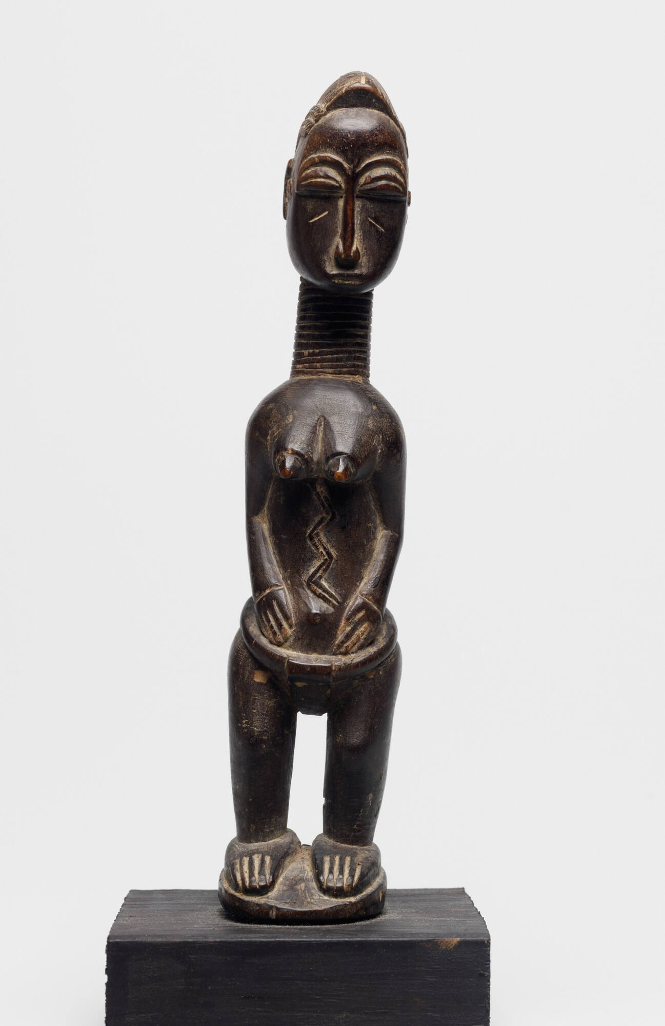 BRIEF DESCRIPTIONThis realistic female figure functioned as an “otherworld mate” for a Baule man. These figures do not represent a deceased mate, but rather a spirit mate who remains in the “otherworld” when one is born.WHERE WAS IT MADE?This was made in the Ivory Coast, in a Baule community.HOW WAS IT MADE?The figure was carved from wood by a commissioned wood carver.HOW WAS IT USED?Figures of this type, called blolo bla (if female) and blolo bia (if male), are physical representations of one’s “other-world mate.” In Baule thought, the blolo, or “other-world,” is a world that exists in contrast to the world of physical reality. The need for a blolo bia or blolo bla is signaled by misfortunes, which are usually sexual in nature. If a man is having difficulty finding a spouse, or a woman is having trouble conceiving, it may indicate that the spirit mate is angry or jealous. In order to appease the spirit mate, a diviner will recommend that the individual experiencing difficulties commission an artist to carve a blolo bia or blolo bla. One night per week, a Baule individual sleeps with the otherworld mate, visits the mate in his or her dreams, and makes a small offering to the figure in the morning.WHY DOES IT LOOK LIKE THIS?Whereas Baule women tend to commission figures dressed in fashionable clothing, men more often prefer nude figures. This figure embodies Baule feminine beauty. Notice the neatly combed coiffure and prominent ears for earrings (now missing); these demonstrate a woman’s capacity for careful bodily maintenance. Other body parts emphasize widely-held aesthetic ideals: the long ringed neck exaggerates the Baule preference for fleshy and strong necks; the substantial thighs and rounded buttocks suggest a woman’s ability to perform hard work; and the protruding navel on a rounded abdomen is favored in many parts of Africa.To see the other blolo figures in the Johnson Museum’s collection, search for these object numbers in the keyword search box: 82.114.007, 89.015.039, and 92.005.070.
