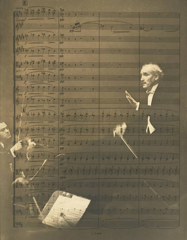 [Photograph of Toscanini overlaid with musical score]