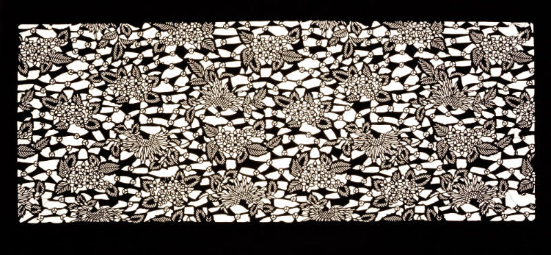 Mulberry bark coated with persimmon juice and cut out with knives, with silk thread reinforcements