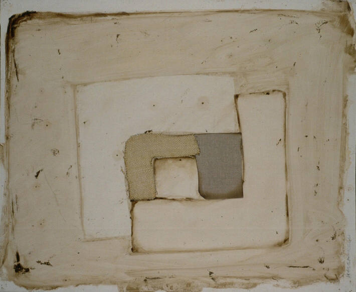 Painted collage of paper and canvas on board