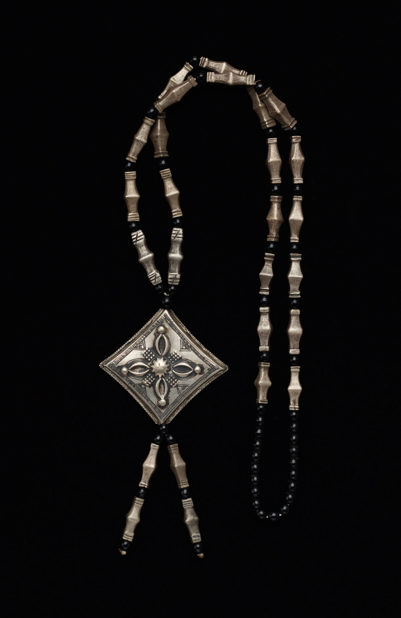 BRIEF DESCRIPTIONAlthough both men and women wear amulets, only women wear this tadnet as an adornment. The cross formation does not carry religious meaning; Tuareg forms and patterns typically do not represent anything in nature, nor do they carry religious significance.WHERE WAS IT MADE?Until very recently, Tuareg peoples lived a nomadic lifestyle, trading and raising cattle around the western Sahara and northwestern Sudan.HOW WAS IT MADE?Blacksmiths make all silver jewelry and leatherwork among the Tuareg. Regarded by the class-based Tuareg as racially and culturally inferior, members of the blacksmith caste nevertheless hold some power in the community. The Tuareg, along with many other African cultural groups, believe that blacksmiths have mystical powers and a special relationship to the elements that allow them to work with fire and earth (metals). With these powers they enjoy special privileges and a certain esteem in the community, but are not regarded by the Tuareg as equals.HOW WAS IT USED?As a result of their itinerant way of life, Tuareg wealth and arts must be movable. Wealth is concentrated in cattle and jewelry, such as this necklace. Other arts valued among the Tuareg such as poetry, music, and dance, create no material culture that must be carried.WHY DOES IT LOOK LIKE THIS?Most Tuareg material culture is symmetrical and non-symbolic. The cross formation of this necklace does not carry religious significance.