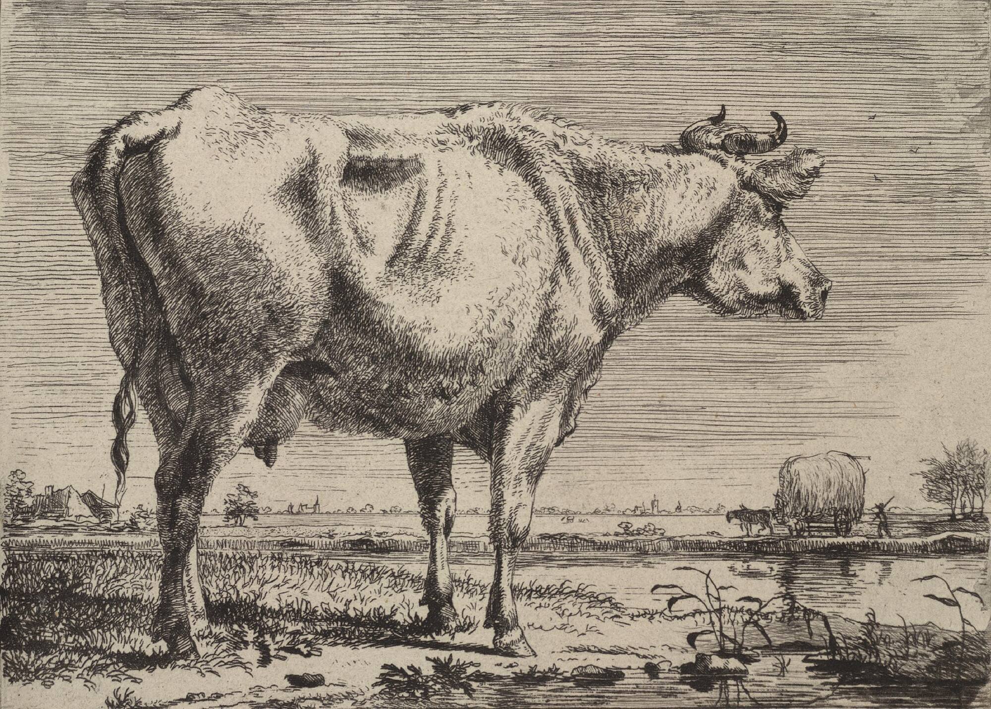 This etching shows a typical flat Dutch landscape, with spires of towns rising in the distance, a farmhouse, barn, and overloaded hay wagon in the middle ground, and a cow standing by water in the foreground: all elements of our mental image of Holland.
