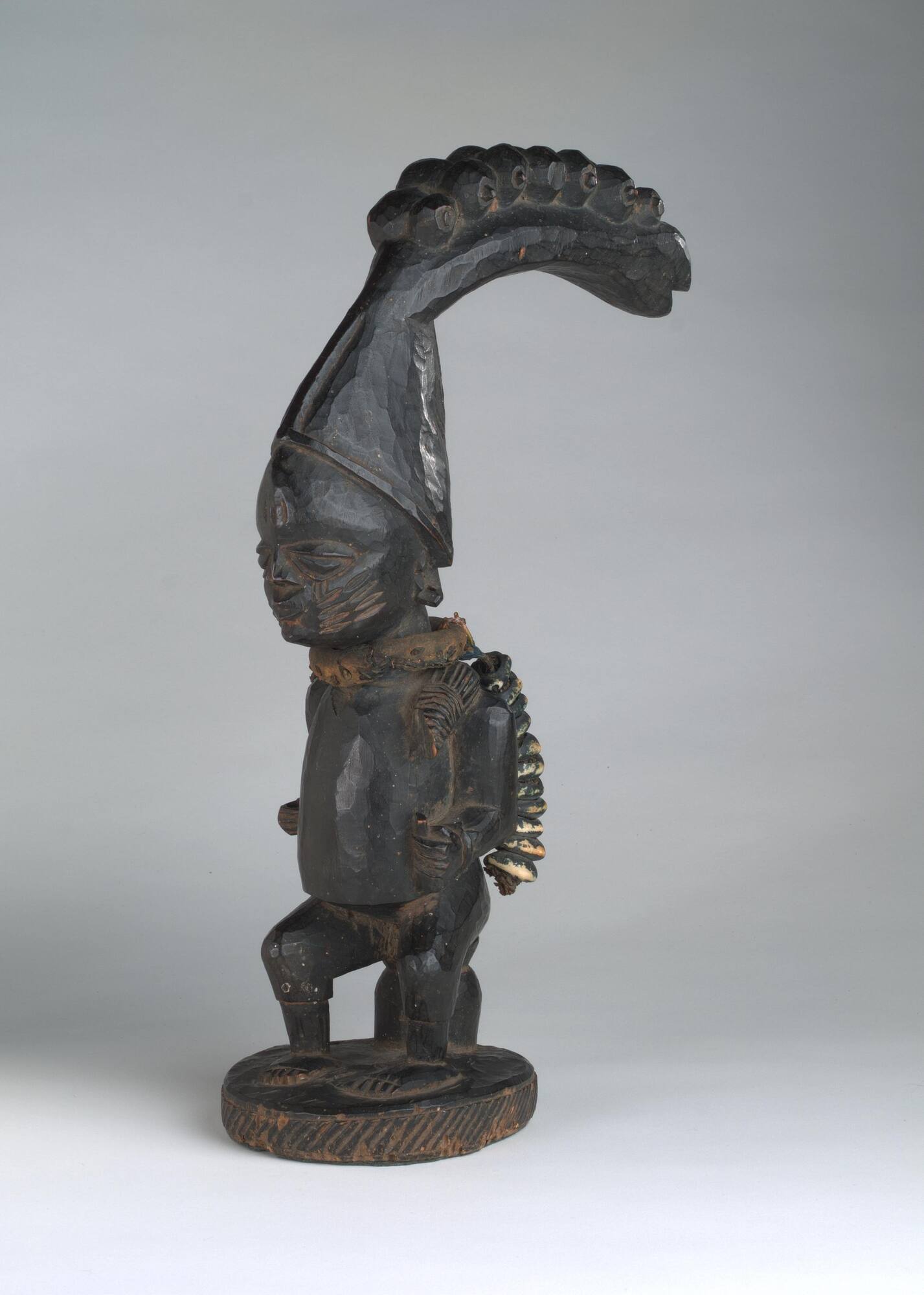 BRIEF DESCRIPTIONThis staff finial depicts Eshu Elegba, an important deity worshipped by the Yoruba. As the divine messenger, he mediates spiritual communication. Eshu stands at the crossroads: between the earthly and spiritual world; between men and women; and between buyers and sellers in the marketplace.WHERE WAS IT MADE?This was made in Nigeria, where the Yoruba people live.HOW WAS IT MADE?These wooden staffs are carved by a sculptor with hand tools such as knives and chisels, and are accompanied by beads and leather collars. Over time, the figures accumulate strings of cowrie shells and other forms of currency from their devotees.HOW WAS IT USED?Eshu Elgeba is an unpredictable deity. A trickster who delights in causing mischief, Eshu must be placated with gifts and acts of worship. Eshu devotees dance publicly with staffs depicting the deity, asking for money in his name. WHY DOES IT LOOK LIKE THIS?Notice the cowrie shells and indigo pigment that decorate the figure. These both signify wealth given in his honor.Notice the unusual, tall hairstyle on this figure. Scholars have interpreted Eshu’s hairstyle in several ways. The extended phallus shape allows a male devotee to free his hands by hanging the sculpture from his shoulder while dancing. On a symbolic level, the tiny gourds that dot the crest of the hairdo reference the powerful medicines used by Eshu Elegba and the second face at the tip of his hair suggests his contradictory nature. The phallic shape in general is not associated with procreation, but with his masculine strength and wild energy. Look at the left shoulder and you will see the sculptural remains of a flywhisk, once held in Eshu’s left hand. This implement is symbolic: the Yoruba king, the oba, has a flywhisk among his regalia. To see a Yoruba flywhisk handle in the Johnson Museum’s collection, search for object number 87.051.002 in the keyword search box.To see another staff finial of Eshu Elegba in the Johnson Museum’s collection, search for object number 91.099.004 in the keyword search box.