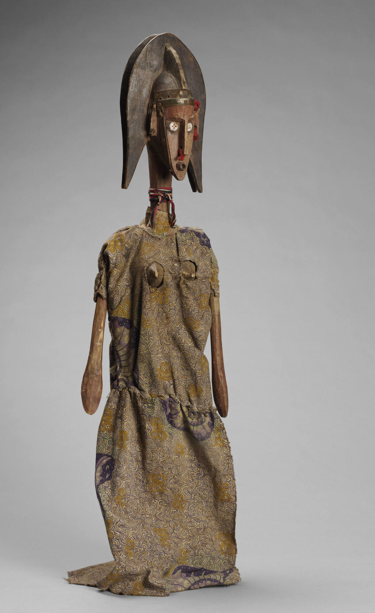 BRIEF DESCRIPTIONMiniature rod puppets like this one take part in the Malian Sogo bò masquerade. They represent a great range of characters from musicians and horsemen, to working women and fishermen.WHERE WAS IT MADE?This puppet was made by the Bamana people in Mali, on the West coast of Africa. HOW WAS IT MADE?A Bamana blacksmith carved the puppet from wood using hand tools such as an adze and knives or chisels. This wood marionette has articulated arms and long plaited coiffure, and has been decorated with button eyes, fiber and metal, and a cloth costume.HOW WAS IT USED?This puppet was performed during the Sogo bò, a masquerade performed in Malian communities. Sogo bò means “the animals come forth,” and the masquerade is associated with men who hunt. Sogo bò is assembled and performed by the village youth association. These associations, or ton, include young men between the ages of fourteen and their early thirties, and women from age fourteen until they are married. Women assist in the performance, but the puppeteers are always men. This miniature rod puppet would have been manipulated (along with other small rod puppets) atop a large animal puppet’s back. The fabric covering that forms the animal’s back conceals 2-3 puppeteers and provides a stage for the puppet performance. To see the head of one of the large animal puppets in the collection of the Johnson Museum, search for object number 81.086.003 in the keyword search box.WHY DOES IT LOOK LIKE THIS?Notice the long, straight nose, elaborate coiffure, colorful yarn jewelry, and exposed taut breasts on this puppet. These features help identify her as Yayoroba, the Beautiful Woman. Known characters such as Yayoroba may perform in different puppet dramas. The dramas bring to life many concerns. They can focus on interpersonal relationships, polygamous marriage, or traditional hunting tales. Audiences praise creativity and innovation in the dramas. Performers respond to this encouragement with stories about divorce or contemporary politics and invent new characters such as the Anthropologist who smokes and takes notes.