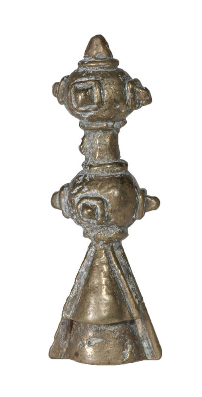 Goldweight in the form of a triangular base and two balls with extensions