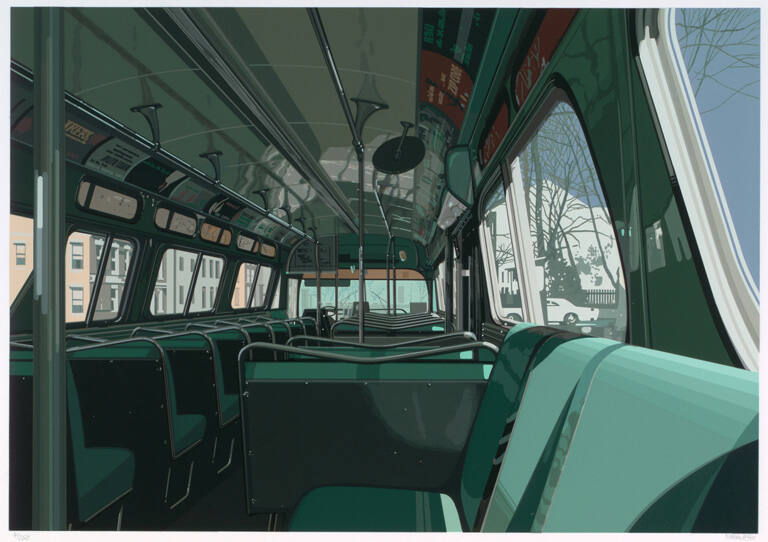 For each of the sites illustrated in these photorealistic screenprints, Estes took multiple photographs from different angles. He used them to render crisp and dazzling compositions that draw attention to the often-overlooked details of such banal spaces as shopping malls, bus and subway interiors, airports, and city streets by exaggerating reflectiveness, light, color, and surface texture. Sometimes requiring as many as150 passes through the press and produced using many hand-applied layers of ink, these exquisite prints invite close observation to appreciate the innovative rendering of urban spaces that Estes is able to achieve. (“All for One and One for All: Portfolios from the Permanent Collection,” co-curated by Andrea Inselmann and Sonja Gandert and presented at the Johnson Museum June 24-August 20, 2017)