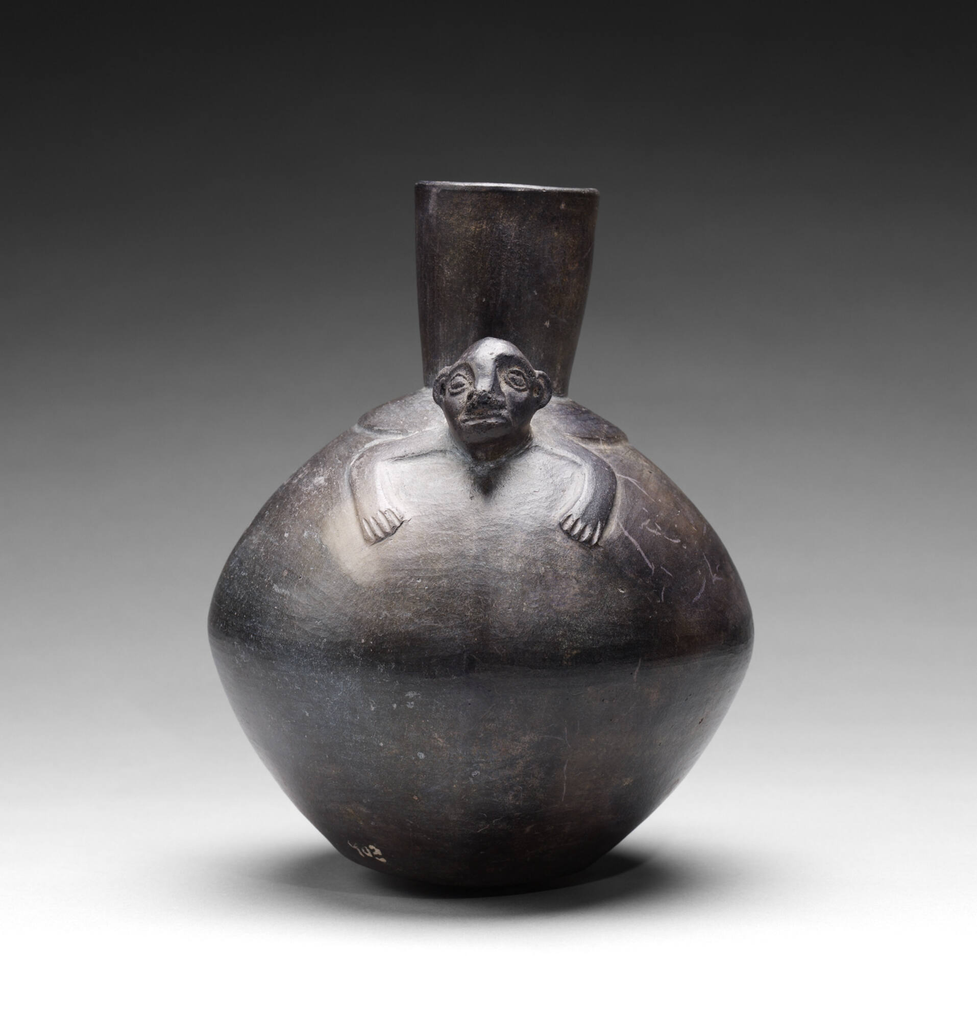 This Late Chimú blackware vessel is mold-made, with a monkey in raised relief on the body of the vessel and a broad, slightly flaring spout rising up from the center of the monkey’s back. Monkeys are very common decorative elements in Chimú pottery.
