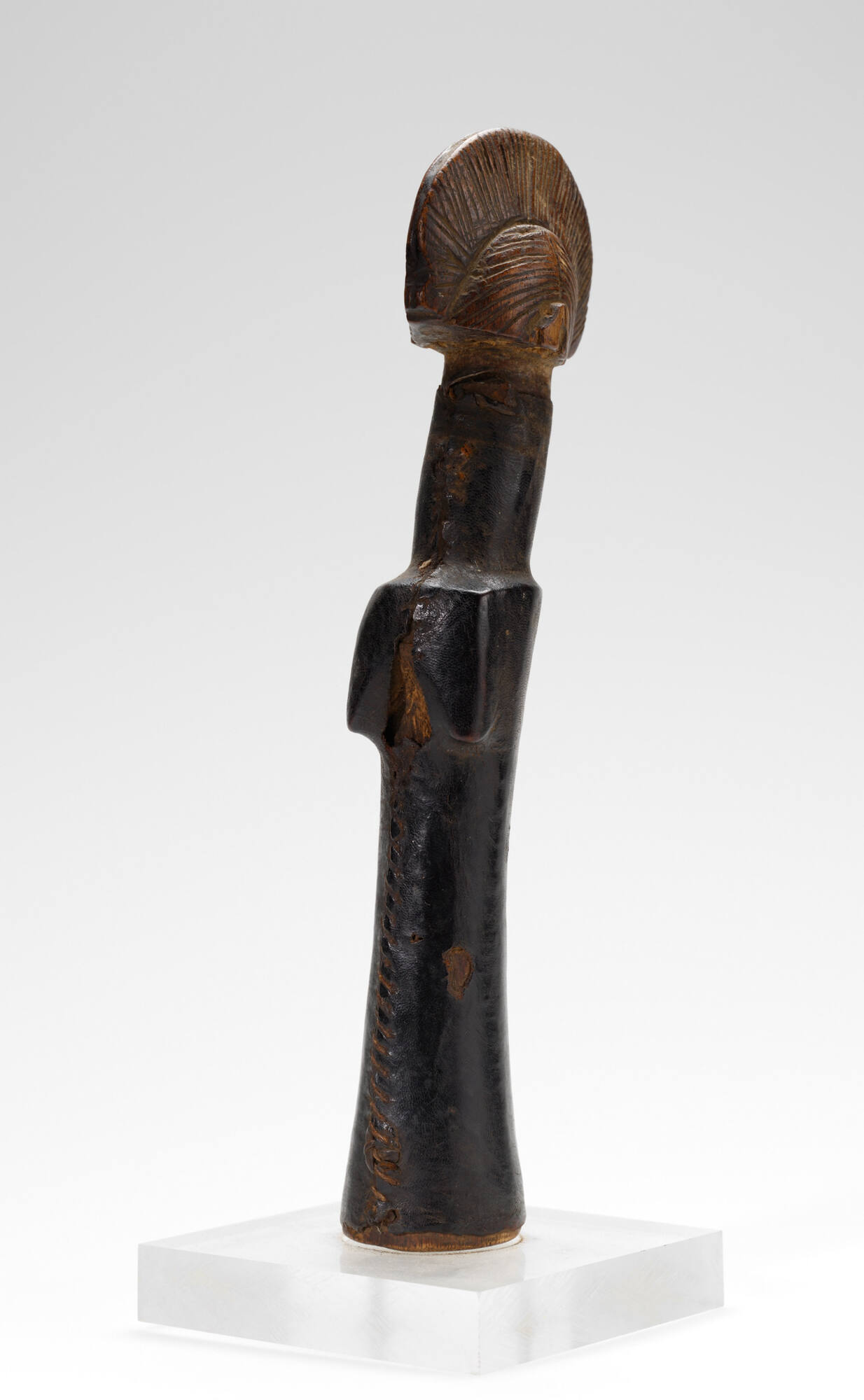 BRIEF DESCRIPTIONThis abstract doll, called a biiga (meaning child), is used by girls and women in a variety of ways.WHERE WAS IT MADE?This was made in Burkina Faso, a country located in West Africa.HOW WAS IT MADE?Blacksmiths carve biiga dolls from wood. Then wet animal hide is often stretched over the wooden figure. This encasement seems not to have particular significance and may be done either by the blacksmith carver or the owner.HOW WAS IT USED?Biiga figures function in many ways. Girls carry around the dolls, feeding and dressing them, as well as tucking them in their clothing at their waist, in imitation of the adult method of carrying real children. Later, a young woman may incorporate the doll into her marriage practices – carrying the doll to market, soliciting names for her newborn, all done in order to encourage the speedy conception of her own child. Dolls are sometimes passed down through the family, though they may also be sold at market for children to use or collectors to buy.WHY DOES IT LOOK LIKE THIS?Although there exists some slight stylistic variations, Moose (pronounced “MOH-say”) dolls share the same basic form: cylindrical bodies, no arms or legs, distended breasts, and a long thick neck surmounted by a wedge-shaped head. The head does not depict a face, so much as a stylized coiffure called a gyonfo. When viewed at a profile, this doll features an abstracted nose and mouth. All biiga figures are female. The distended breasts imply motherhood, a role highly valued among the Moose. The absence of arms, legs, and other physical attributes demonstrates that only the uniquely female features (hairstyle and breasts) identify the doll; all other attributes are unnecessary. The presence of well-developed breasts suggests that the doll would be understood as a mature woman; nevertheless, the dolls are called biiga (child).To see another biiga doll in the Johnson Museum’s collection, search for object number 84.012.004 in the keyword search box.