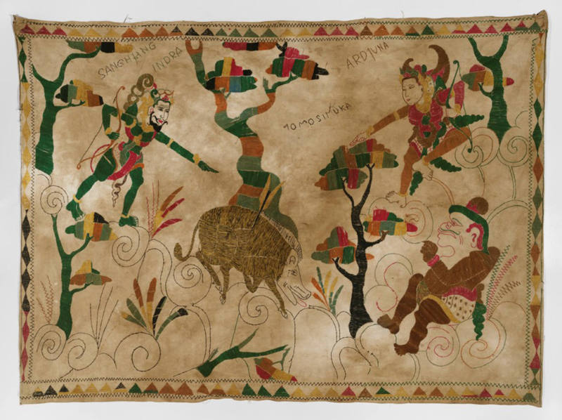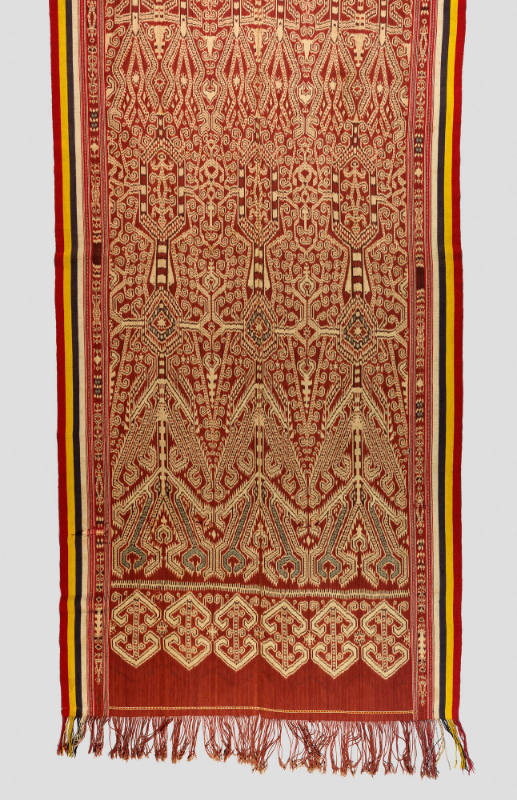 BRIEF DESCRIPTIONBamana people call this fabric bokolanfini or “mudcloth.” This bokolanfini skirt pattern, the Cheli Djou, is associated with married women.WHERE WAS IT MADE?The cloth was made in Mali, West Africa.HOW WAS IT MADE?The materials needed to make bokolanfini (cotton, leaf dyes, and mud) are all available locally. After women prepare the raw cotton and men weave it into strips, the pieces are sewn together. Women dip the resulting creamy white fabric into a dye bath made from n’galaman and changora leaves and branches. The fabric emerges a bright yellow color, which is later washed away. (It is not known precisely why the makers undertake this step; it has been suggested that this initial dying makes the mud-staining less likely to bleed.) Women prepare a solution made from mud collected from pond floors and left to stand for a year. The dark mud is painted onto the fabric, leaving white-line designs. HOW WAS IT USED?Traditionally, mudcloth is made-to-order and is used for skirts or wraps called bokolan. Today the fabric is being produced on a large scale for sale in local and international markets. However, most Bamana women no longer use the bokolanfini for their bokolan. They prefer imported printed cloth for its comfort and ease in cleaning.WHY DOES IT LOOK LIKE THIS?Made in a Kolokani style, which typically features sharply delineated lines and high contrast between the dark and light portions, this bokolanfini skirt features the most traditional and, in many ways, most valued mudcloth design. Women lay out the designs freehand and maintain consistent widths for the white lines. These white lines are not painted on; rather, the dark portions are painted, leaving areas of exposed fabric. Today, artists in Mali produce many styles of bokolanfini, such as genre scenes, images of animals, and patterns drawing upon a wider range of earth tones. DESIGNS:This bokolanfini skirt pattern, the Cheli Djou, is associated with married women. Its crisscross pattern of diamond-shaped lines is named after a locally made string bag called a cheli djou, which a newly married woman would use to transport her trousseau of cooking pots to her husband’s village. A stretched bag creates the string diamond design used on the skirt. An open square design called the Dabiri So, means “to cover the opening.” On a married woman’s skirt, the pattern may imply that the couple should endeavor to protect each other, as well as members of their extended families.The design that recalls an iron cross, the Baarafeere So, refers to the white flowers of the Baara gourd plant. The very large gourds produced by the Baara plant are used as containers for the newlywed woman to store and carry her trousseau of cotton skirts.The hourglass design called the Dongangolo is named after a traditional drum used by a griot on the occasion of a successful marriage or circumcision.The diagonal incomplete rectangle pattern placed within the open square of the Dabiri So is called Filin Ngoloni. The name references loss and the stick used to beat a particular drum when someone is lost in the forest or when highly honored people in the village die. Placed within the Dabiri So, the Filin Ngoloni may suggest that because it is easy to lose people, one must be vigilant about protecting one’s social relationships.The artist used diamond-shaped lines called Nkerekan or “cricket’s neck” to create the Cheli Djou pattern. The diamond shape visually imitates the form of the cricket’s neck. Its significance lies with the appearance of crickets at the end of the rainy season – the sound of many crickets is a good omen and suggests abundant crops.The string of squares encasing simple crosses is called the Fali Fereke and references a thick cord used to inhibit a donkey’s wandering. It suggests that upon having children, a woman’s actions should be restricted. Prior to childbearing, but after marriage, a woman is free to pursue her own interests – even lovers.A heavy rectangle crossed with equally heavy bars is the Ntabani design. Named after a tree that produces a stimulating fruit, this design is never seen, but is concealed under the overlapping skirt.To see other bokolanfini in the Johnson Museum’s collection search for object numbers 87.012.002, 87.012.003, 87.012.004, and 87.012.005 in the keyword search box.
