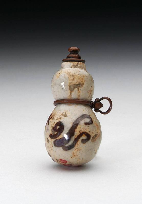 BRIEF DESCRIPTIONThis is a porcelain netsuke in the form of Jurojin, a Japanese god of longevity.WHERE WAS IT MADE?This netsuke was made in Japan.HOW WAS IT MADE?Netsuke made from porcelain, like this one, were hand-modeled from a white clay containing kaolin, then glazed and fired in a kiln.HOW WAS IT USED?During the Edo period (1603-1868), the standard attire for a well-dressed Japanese man consisted of a kimono tied with a sash. Because kimonos had no pockets, accessory bags and carrying cases (called sagemono: hanging things) were used to hold personal items such as money, medicines, tobacco and seals (a stamp carved with the owner’s name). Silken cords, attached to the sagemono, were threaded through the kimono sash (obi). A toggle, called a netsuke, was attached to the other end of the cord to prevent it from slipping through the sash. To see a netsuke with an inro—one popular type of sagemono that consisted of small, stacked compartments for holding medicines—search for object number 98.087.006 in the keyword search box.The term netsuke comes from the words “ne”, meaning ‘root’ and “tsuke”, meaning ‘to fasten.’ Early netsuke may have been made from found objects such as pieces of roots, nuts, coral and bone. Over time, netsuke production became more and more varied, refined, and innovative, reaching a high point in the early 19th century. Subjects and decoration of netsuke and sagemono reflected the tastes and aspirations of their owners, often infused with an element of comic irony. As clothing traditions modernized, netsuke came to be collected separately from sagemono, and appreciated as sculptural gems in their own right.WHY DOES IT LOOK LIKE THIS?Notice that this figure has an especially tall head, and is carrying a staff. In another hand he carries a fan. These are all attributes common to the God of Longevity, one of the Seven Gods of Good Fortune. His large head may be a sign of his accumulated wisdom.