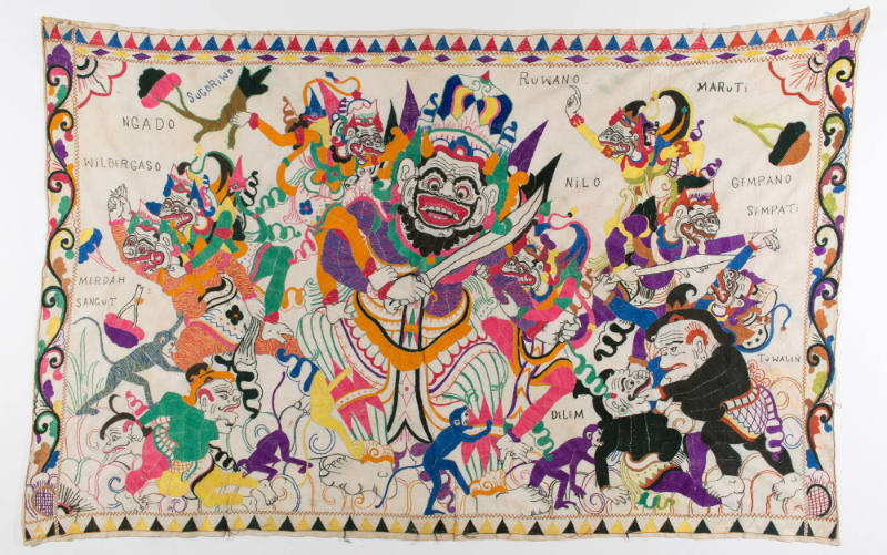 Rectangular hanging (tabing) with a scene of Kumbakarno Battling the Monkey Army, from the Ramayana