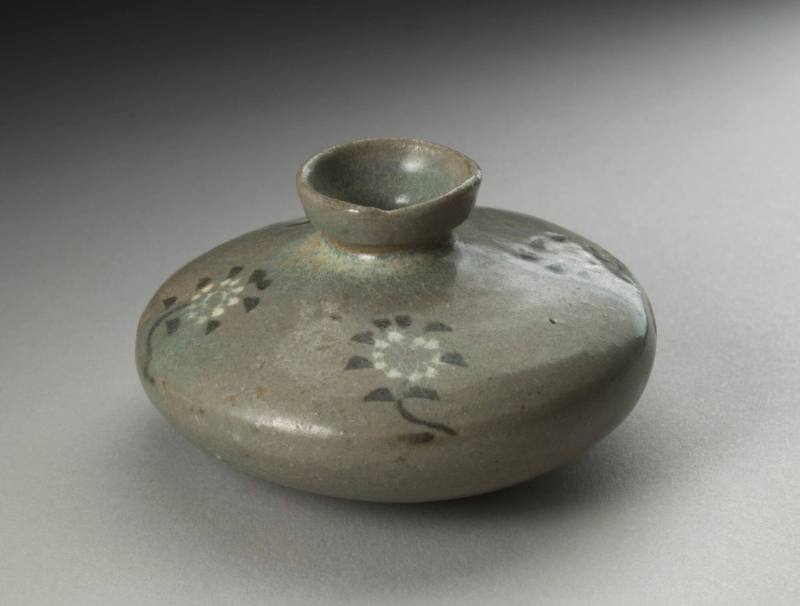 Mishima ware (porcelaneous stoneware), with black and white slip under celadon glaze