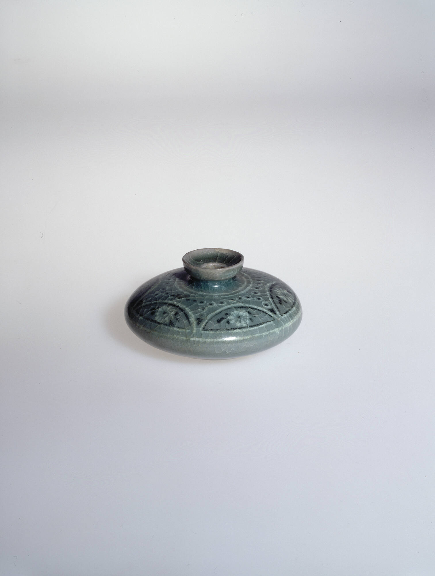 Korean celadons of the Koryo Dynasty rank among the finest ceramics in the world, long admired for the wonderful color of glaze that matched in beauty the more famous celadons produced at the same time in China. In addition to perfecting the celadon color, Korean potters developed a special technique of inlay whereby a design incised on the clay was filled with white and black slip, the excess brushed off, and the piece fired to produce a sharp contrasting pattern underglaze. This small oil bottle is an especially fine example of Koryo period inlay workmanship, combined in this case with a delicacy of shaping and potting that produced a miniature vessel of exquisite proportions. Notable decorative devices used by the potter here are the lunette containing a white chrysanthemum and black leaves, and the strand of pearl-like dots with black centers that rings the neck and shoulders of the jar. (From “A Handbook of the Collection: Herbert F. Johnson Museum of Art,” 1998)