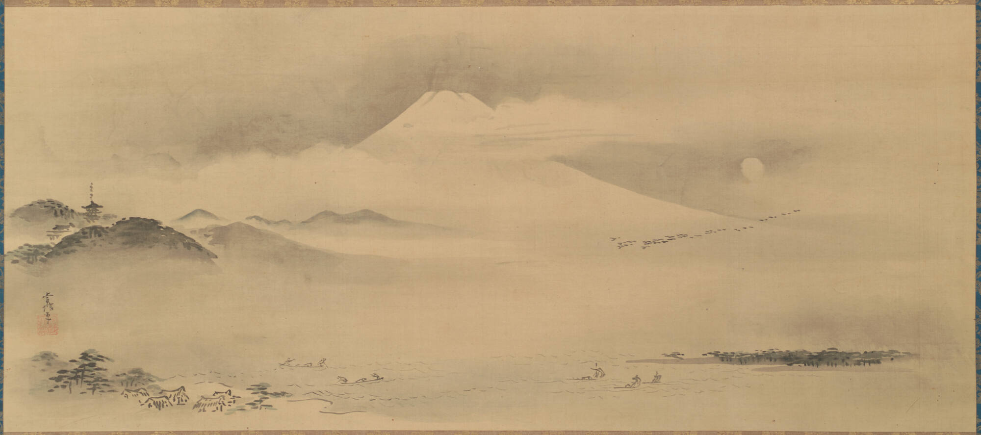 The Kano lineage of painters was among Japan’s most long-lived schools, remaining a conservative force in Japanese painting for some four hundred years. Their monochrome ink landscapes, ultimately modeled on the misty, idealized Chinese Southern Song painting tradition, remained popular among aristocratic and temple patrons for large-scale screens, as well as more intimate works, such as these scrolls, made for private quarters.Kano Tsunenobu, nephew of the pivotal early Edo-period master Kano Tanyu (1602-1674), followed the traditional formula in his compositional approach by confining the dense landscape elements into one corner of the painting, and counterbalancing this with seemingly unending watery and misty expanses. Admired for his deft brushwork, Tsunenobu employed the wet, ink outlines, axe-cut textural strokes, and delicate washes that characterize the lyrical Kano style.