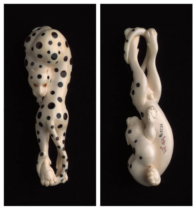 BRIEF DESCRIPTIONThis is a wooden netsuke carved in the form of a snarling tiger.WHERE WAS IT MADE?This netsuke was made in Japan.HOW WAS IT MADE?Netsuke made from wood, like this one, were hand-carved with knives, chisels and files of different sizes. On this netsuke, ink was used to darken the finely incised lines of patterning and detail.HOW WAS IT USED?During the Edo period (1603-1868), the standard attire for a well-dressed Japanese man consisted of a kimono tied with a sash. Because kimonos had no pockets, accessory bags and carrying cases (called sagemono: hanging things) were used to hold personal items such as money, medicines, tobacco and seals (a stamp carved with the owner’s name). Silken cords, attached to the sagemono, were threaded through the kimono sash (obi). A toggle, called a netsuke, was attached to the other end of the cord to prevent it from slipping through the sash. To see a netsuke with an inro—one popular type of sagemono that consisted of small, stacked compartments for holding medicines—search for object number 98.087.006 in the keyword search box.The term netsuke comes from the words “ne”, meaning ‘root’ and “tsuke”, meaning ‘to fasten.’ Early netsuke may have been made from found objects such as pieces of roots, nuts, coral and bone. Over time, netsuke production became more and more varied, refined, and innovative, reaching a high point in the early 19th century. Subjects and decoration of netsuke and sagemono reflected the tastes and aspirations of their owners, often infused with an element of comic irony. As clothing traditions modernized, netsuke came to be collected separately from sagemono, and appreciated as sculptural gems in their own right.WHY DOES IT LOOK LIKE THIS?The Chinese calendar follows a sixty-year cycle, broken into five twelve-year units. Each of the twelve years is associated with an animal. The day is also divided into twelve periods, each associated with one of the twelve animals. The animals associated with the year and the hour of one’s birth have long been used in some Asian countries to predict one’s character and personality traits. The animals of the zodiac became popular subjects for netsuke during the 19th century, as people became interested in purchasing netsuke depicting the animal associated with their birth year, as well as building collections of all twelve animals. The twelve animals are rat, ox, tiger, rabbit, dragon, snake, horse, goat, monkey, rooster, dog and pig. The tiger is a symbol of strength and power. In the zodiac, it is associated with qualities such as passion, daring, impulsiveness, and generosity. The tiger is also a companion to one of the Buddha’s disciples, known in Japan as Hattara Sonja. To see a painting of Hattara Sonja with a tiger in the Johnson Museum’s collection, search for object number 94.014.003 in the keyword search box. To compare this wooden netsuke of a tiger with one made from clay, also in the Johnson Museum’s collection, search for object number 87.048.064 in the keyword search box.