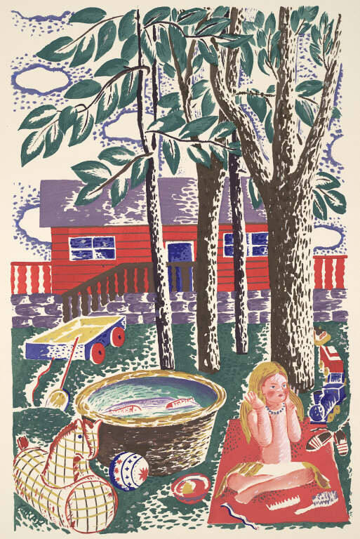 Karasz studied at the Royal Academy of Arts and Crafts in Budapest before coming to the United States as a young artist. Creative in many disciplines including decorative art, pottery, tiles, wallpaper design, toys, and lamps, she also became involved with the production of fabrics, rugs, silverware, china, and furniture and was the founder-director of Design Group Inc. As the use of silkscreen developed in the 1930s, Karasz became one of the first to use it for nonindustrial purposes. Her folk-style designs in bright colors, often seen in the covers she created for the New Yorker for nearly fifty years, was well suited to this new medium. (“Imprint/ In Print,” curated by Nancy E. Green with assistance from Christian Waibel ’17 and presented at the Johnson Museum August 8 – December 20, 2015)