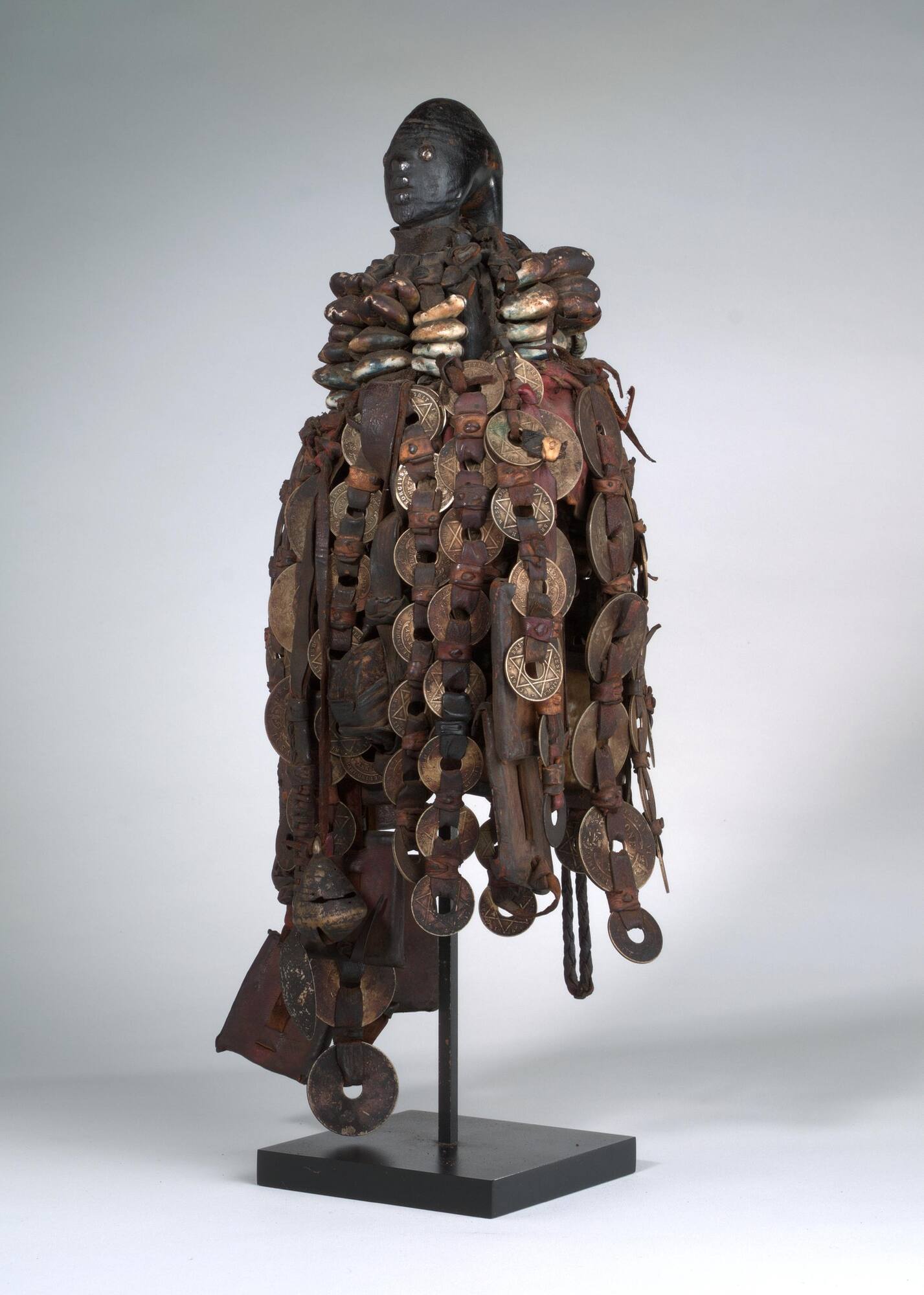 BRIEF DESCRIPTIONThis staff finial depicts Eshu Elegba, an important deity worshipped by the Yoruba. As the divine messenger, he mediates spiritual communication. Eshu stands at the crossroads: between the earthly and spiritual world; between men and women; and between buyers and sellers in the marketplace.WHERE WAS IT MADE?This was made in Nigeria, where the Yoruba people live (indicated by the red circle on the map attached to this record.)HOW WAS IT MADE?These wooden staffs are carved by a sculptor with hand tools such as knives and chisels, and are accompanied by beads and leather collars. Over time, the figures accumulate strings of cowrie shells and other forms of currency from their devotees.HOW WAS IT USED?Eshu Elgeba is an unpredictable deity. A trickster who delights in causing mischief, Eshu must be placated with gifts and acts of worship. Eshu devotees dance publicly with staffs depicting the deity, asking for money in his name.WHY DOES IT LOOK LIKE THIS?Notice the cowrie shells, indigo pigment and strings of coins that decorate the figure. These all signify wealth given in his honor.Notice the unusual hairstyle on this figure. Scholars have interpreted Eshu’s hairstyle in several ways. Its phallic shape is not directly associated with procreation, but with his masculine strength and wild energy. The braided leather strap hanging from the hair would have allowed a female devotee to fix the figure to her garments, freeing her hands for expressive dance.A staff of this size might have been danced with its female counterpart; Eshu Elegba appears in both male and female form.To see another staff finial of Eshu Elegba in the Museum’s collection, search for object number 86.080.001 in the keyword search box.