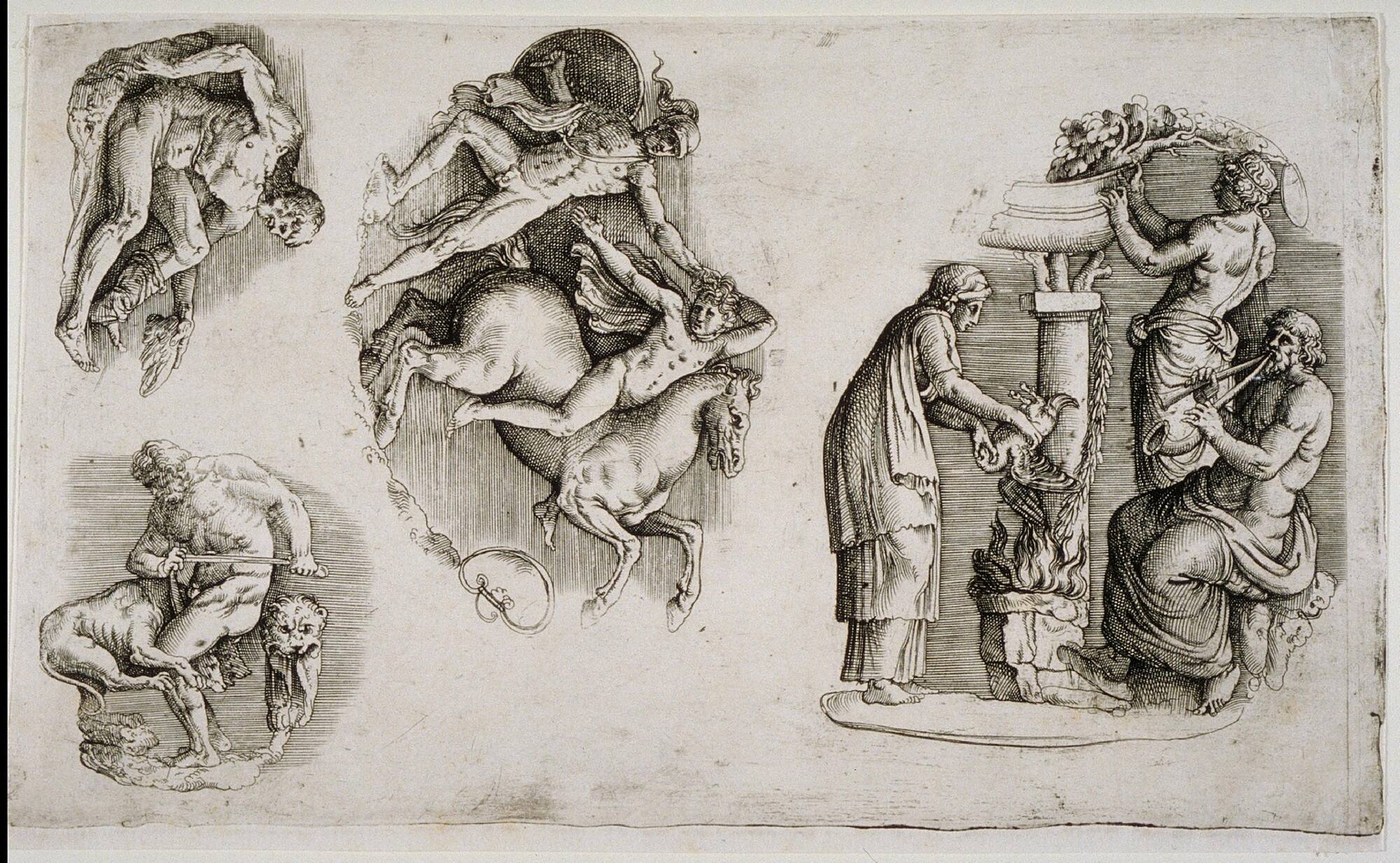 The period in which the artist Giovanni Battista Franco lived was a time of renewed enthusiasm for the writings and art of ancient Greece and Rome. As such, ancient carved gemstones and cameos became highly sought after, just as they were in antiquity. In 1551, Franco was commissioned to engrave a series of prints illustrating gems and cameos from the collection of Giovanni Grimani, Bishop and Patriarch of Aquileia. The subjects of the four cameos seen here are more and less identifiable, but Hercules taking the three-headed hound Cerberus can be found at lower left.