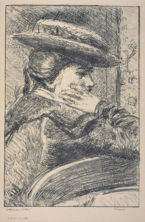 Though he showed artistic talent early in his life, Walter Sickert was discouraged by his artist father, Oswald, from pursuing it, and instead he became an actor. But after less-than-distinguished attempts he enrolled in art school and began to study under Whistler. In 1883 Whistler asked him to act as courier, accompanying his Portrait of the Artist’s Mother to the Paris Salon. There Sickert met Edgar Degas and began to study with him, while also continuing with Whistler for the next several years. Like both his teachers, Sickert was interested in rendering everyday life and, particularly, class distinctions. In Little Sallie Waters (The Straw Hat) he depicts a young woman market seller, known as a costermonger. These women, in their common, flat-topped hats, were frequently the subjects of Sickert’s students and other members of the Camden Town Group. Besides this print, Sickert rendered costermongers in many of his paintings. (“The Touch of the Butterfly: Whistler and His Influence,” curated by Nancy E. Green and presented at the Johnson Museum August 4-December 16, 2018)