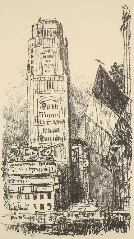 Inspired by a “Preparedness Parade” (for the US involvement in the war), Hassam began a series of over thirty paintings and prints of Fifth Avenue (renamed the “Avenue of the Allies” during the Liberty Loan Drives of 1918), showing the vast crowds that participated. Thousands of people came out for them, and they frequently lasted as much as twelve hours.An avid Francophile, and strongly anti-Germany, Hassam enthusiastically backed the Allied cause and the protection of French culture. Along with his wife, he joined with other artists in the war relief effort from nearly the beginning of the conflict in 1914, when most Americans as well as President Woodrow Wilson were decidedly isolationist. Hassam considered volunteering to record the war in Europe, but the government would not approve the trip. He was even arrested (and quickly released) for innocently sketching naval maneuvers along the city’s rivers. In addition to the time he gave to many committees, several of his flag pictures were contributed to the war relief in exchange for Liberty Bonds. Although he had great hopes that the entire series would sell as a war memorial set (for $100,000), the pictures were sold individually after several group exhibitions, the last at the Corcoran Gallery in 1922. (“‘The War to End All Wars’: Artists and World War I,” curated by Nancy E. Green and presented at the Johnson Museum, January 21-June 11, 2017)