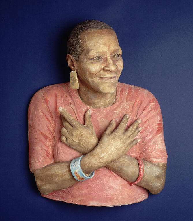 John Ahearn is one of a large number of important artists who attended Cornell University, including Arthur G. Dove, Margaret Bourke-White, Richard Artschwager, and Susan Rothenberg. He was trained as a painter at Cornell, but found himself as a sculptor when he moved to the South Bronx in his twenties. Here, in collaboration with Rigoberto Torres, he opened a storefront studio and began making life-size casts of the people who lived in the area. He met Ernestine, the subject of this work, at a women’s shelter and was particularly impressed with her energy and optimism. The simplicity of the pose, the rough modeling of details, and the thin, quick application of the paint all help express the unpretentious directness and spontaneity of the sitter herself. Small details — the red and blue bracelets, the Nefertiti earrings, the lifted left index finger — add to the energy of the figure, and to the humanity of her remarkably expressive face. (From “A Handbook of the Collection: Herbert F. Johnson Museum of Art,” 1998)