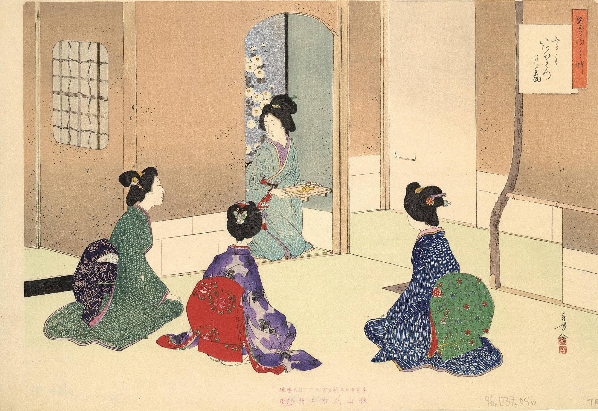 The host appears by an arched doorway. Hidden behind the doorway is a tea preparation area, known as mizuya. Greeting her guests and holding a tray of sweets, the host is about to enter the room and offer sweets for her guests to enjoy. In Japanese tea ceremony, it is customary to have sweets before having tea. Mizuno Toshikata’s A Tea Ceremony Periwinkle is a well-known series of prints that illustrate different scenes of Japanese tea ceremony.