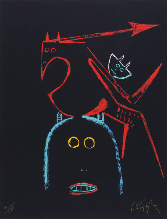 When, on September 11, 1973, military forces led by General Augusto Pinochet staged a US–backed coup d’état and deposed Salvador Allende, the democratically elected socialist president of Chile, the international community’s response was instantaneous. In France, the Comité France-Amérique Latine mobilized eleven Latin American artists to produce an album of screenprints as both a gesture of solidarity and a vehicle to raise funds to support Chilean students studying in France who had lost their scholarships, as well as those who had been forced to flee Chile and seek refuge in France. The portfolio includes work by such heavyweights as Wifredo Lam, Roberto Matta, Jesús Rafael Soto, and Carlos Cruz-Diez, as well as lesser known artists from across the region.The portfolio also includes an introductory statement by Jean Cassou, a writer, poet, and cultural preservationist who served as the first Director of the Musée National d’Art Moderne in Paris. Cassou decries the coup, strongly criticizing the unfettered capitalism that, he argues, drives the imperialist tendency of the United States to intervene in Latin American democracies. (“All for One and One for All: Portfolios from the Permanent Collection,” co-curated by Andrea Inselmann and Sonja Gandert and presented at the Johnson Museum June 24-August 20, 2017)In this dark, colorful print, three distinct figures stare directly at the viewer. Their bodies are not entirely clear, the blue figures truncated at the head while the red one appears to dissolve into abstraction. This assemblage of three incomplete monsters is stylistically typical for Lam, who throughout his career combined disparate figural fragments into original compositions. These elements drew equally from the Afro-Cuban religious traditions of his native country and the avant-garde movements of surrealism and cubism that he was steeped in during his time in Spain and France, where he lived for nearly twenty years before returning to Cuba in 1941. Lam, like many of his contemporaries, was staunchly political; this print, as well as that of Venezuelan artist Jesús Rafael Soto (also on view in this section), is part of a portfolio of screenprints by eleven Latin American artists published by the Comité France-Amérique Latine in a gesture of solidarity for the victims of Chilean President Augusto Pinochet’s 1973 coup d’état. (“Imprint/ In Print,” curated by Nancy E. Green with assistance from Christian Waibel ’17 and presented at the Johnson Museum August 8 – December 20, 2015)