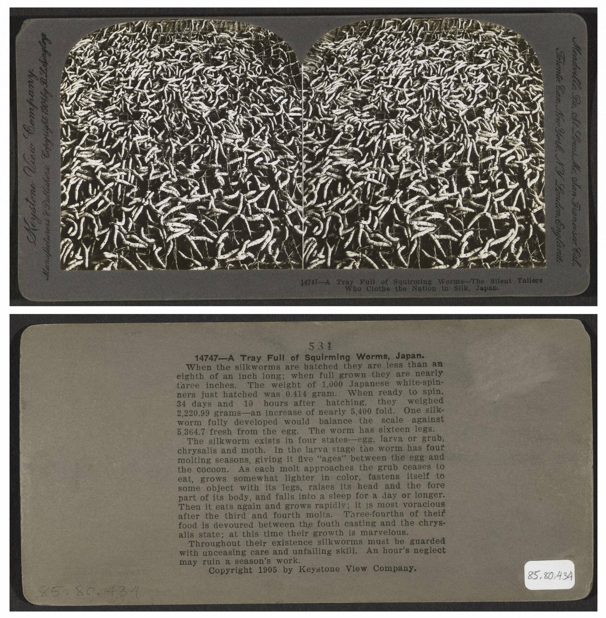 A tray full of squirming worms—The silent toilers who clothe the nation in silk, Japan