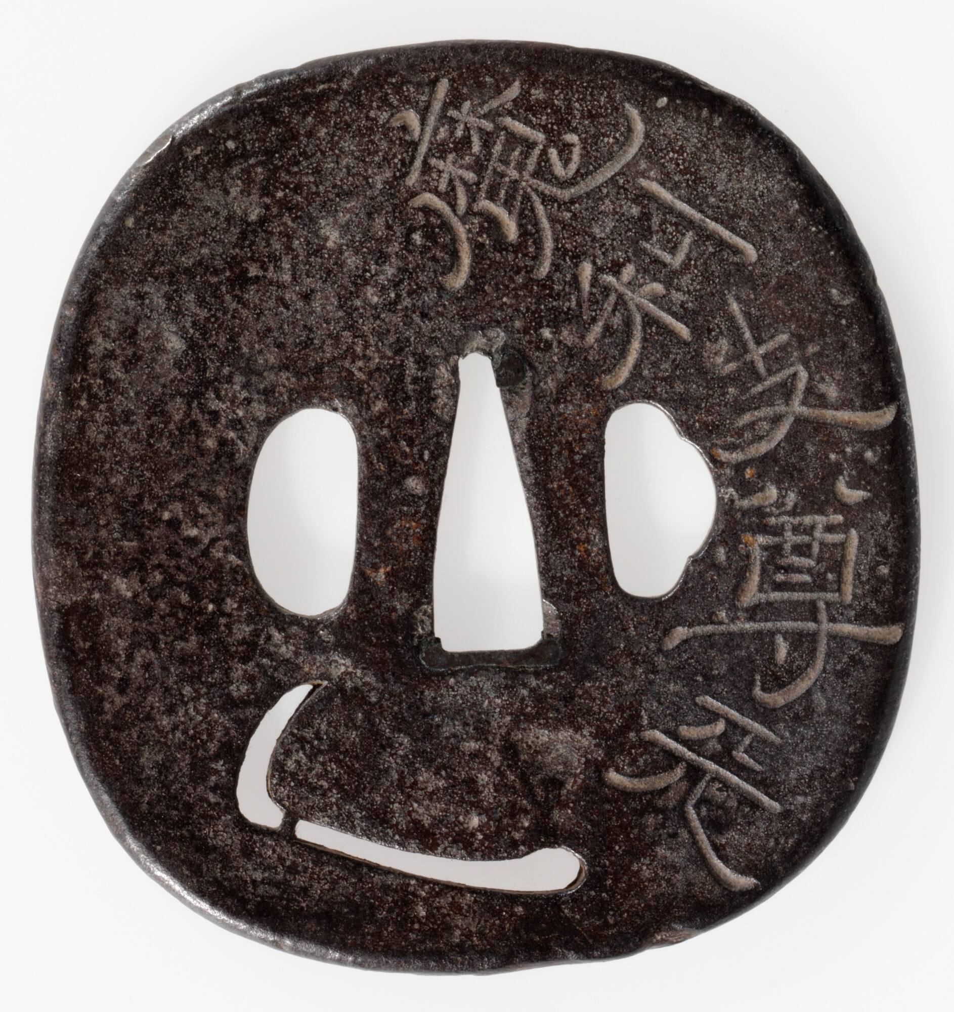 Rounded square tsuba with five characters and pierced design of wood cutter’s axe