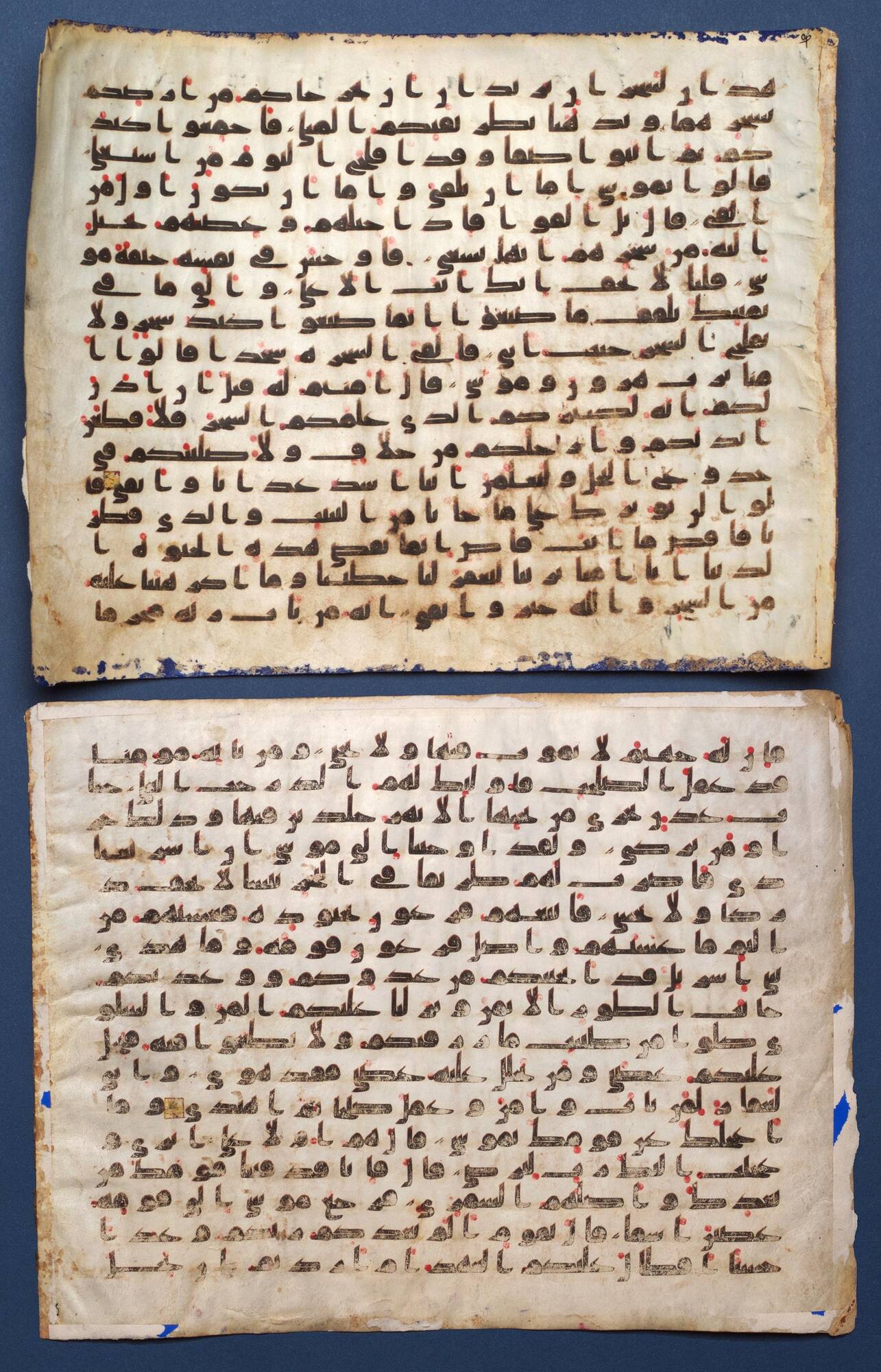 The Qur’an, or “recitation,” is the word of God (Allah) revealed to the prophet Muhammad. Early Qur’ans were transcribed in Kufic script arranged in a horizontal format on vellum (parchment). The scribe used a reed pen for the rather spare script, which is read from right to left, and carefully attended to the squat angular letters and straight horizontal strokes. Because different sounds might be shared by a single letter of the Arabic alphabet, the red diacritical marks guide the reader to the correct pronunciation.