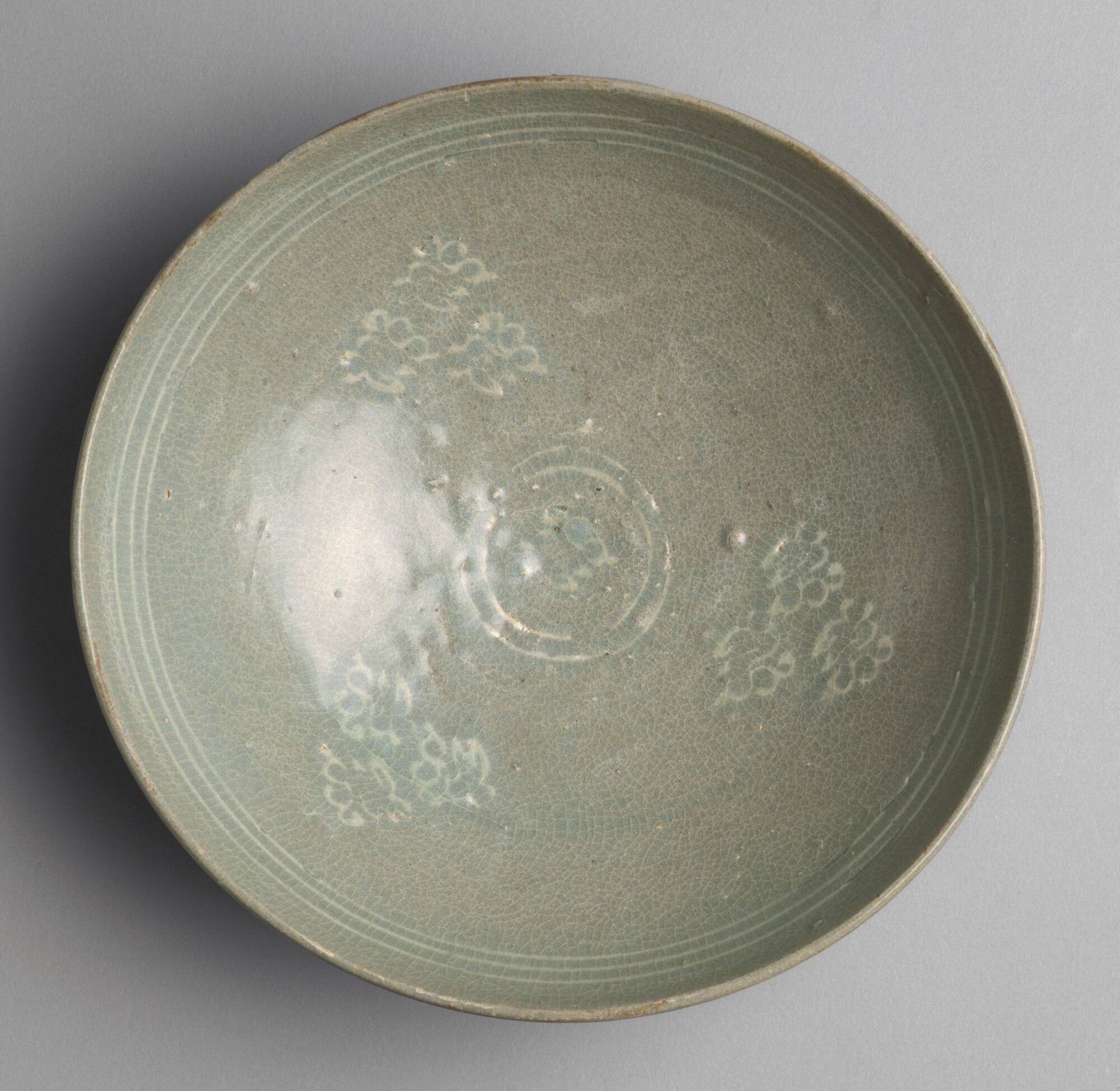 Glazed stoneware with celadon glaze and inlaid designs in white slip