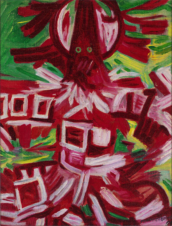 The Abakuá society is a Cuban all-male secret brotherhood and mutual aid society with lodges in Havana and in the province of Matanzas, which descended from the Ekpé society of the Calabar region of Nigeria with the arrival of slaves to Cuba. Initiates, known as ñáñigos, are known for their distinctive conical hats and tasseled costumes. Portocarrero paints an ireme, or diablito (little devil), whose role within the society is to enforce the tenets of the brotherhood. His broad and frenetic brushstrokes convey the energy and dynamism of the ireme’s dance while the shallow depth of field and dense yellow and green background amplifies the immediacy of the representation. Ekpé is also known as the society of the leopard; the square-patterned cloth of Portocarrero’s diablito may have been inspired by the leopard’s patterned fur, from which Ekpé costumes were originally made.In the decades following the Cuban revolution of 1959 (three years after Portocarrero made this painting) and particularly during the Special Period (an era of economic instability in Cuba following the fall of the Soviet Union), Afro-Cuban religion and traditions were often appropriated by the government as an exportable expression of Cuban culture. As such, the ireme is often used in promotional material and representations appear in tourist souvenirs. (“This is no Less Curious: Journeys through the Collection” cocurated by Sonja Gandert, Alexandra Palmer, and Alana Ryder and presented at the Johnson Museum January 24 – April 12, 2015)