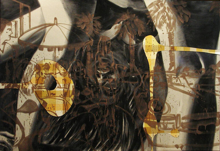 Acrylic, oil and fabric on canvas