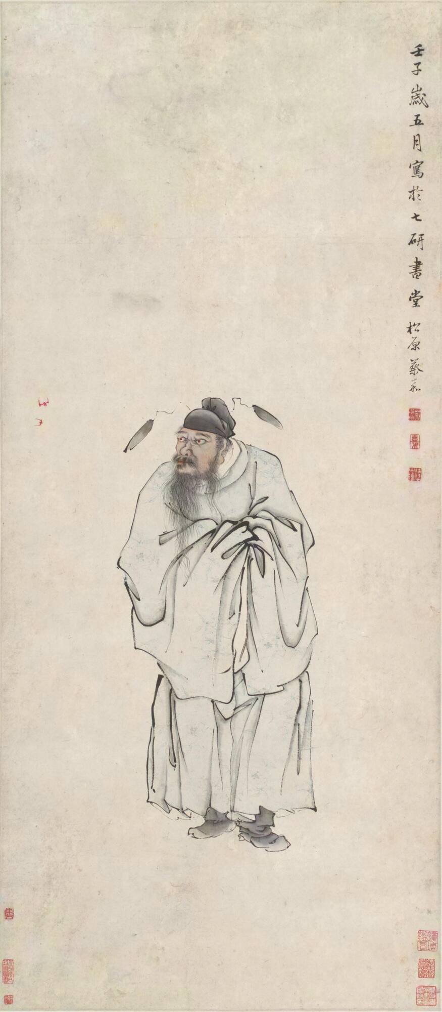 Pictures of Zhong Kui, the Demon Queller who eradicates evil spirits, are traditionally hung in doorways around the time of the Lunar New Year, or on the fifth day of the fifth month (Double Five Festival). Zhong Kui’s exploits against demons pave the way for the arrival of good fortune. The two tiny red bats symbolize the arrival of happiness, since the Chinese words for red bat (hong fu) and abundant happiness (hong fu) are homonyms. The two red bats also draw attention to Zhong Kui’s bloodshot eyes.Cai Jia, an accomplished professional painter, lived in Yangzhou, Jiangsu province. He excelled in flower and bird painting as well as the so-called “blue-and-green” landscape painting. His figure painting as shown in Zhong Kui and Bats also reached a vivid and expressive depiction. The collectors’ seals show that this painting was once owned by Wang Yangdu, a well-known collector of the nineteenth century, and was later collected by Di Pingzi and Qian Jingtang, two major collectors of the early twentieth century. (“Tradition, Transmission, and Transformation in East Asian Art,” curated by Cornell PhD student Yuhua Ding under the supervision of Ellen Avril and presented at the Johnson Museum January 23-June 12, 2016)