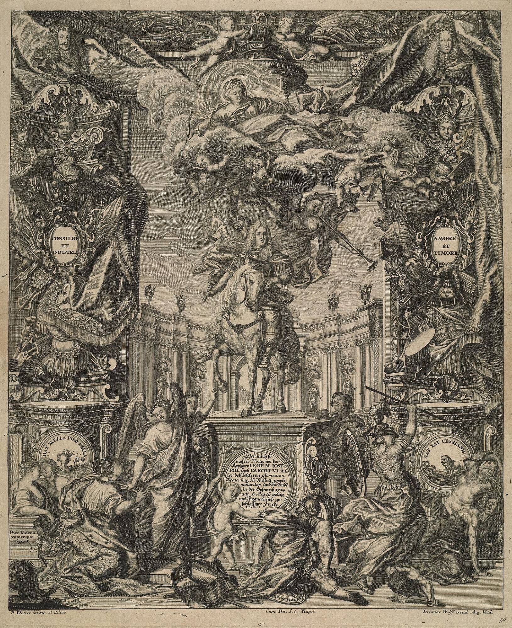 Memorial Commemorating the victories of Leopold I, Joseph I, and Charles VI of Austria, and the Treaties of Rastatt and Baden, plate 56 from Decker’s Architectura Civilis