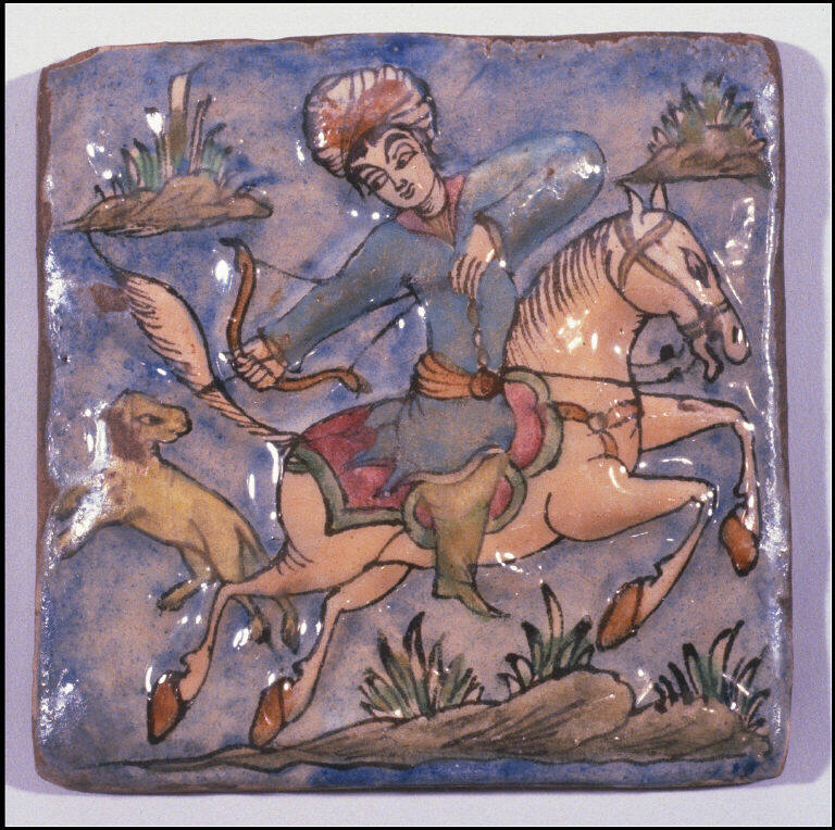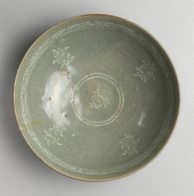Stoneware decorated with underglaze iron on cream slip and covered with now degraded glaze