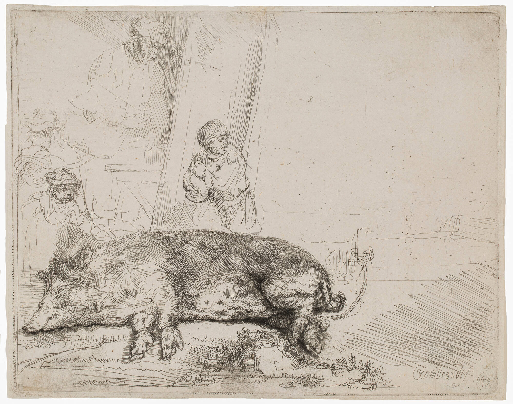 The Hog mixes a more traditional genre topic with the lower classes’ practical relationship with animals. Here, a peasant family gathers excitedly around a fatted sow tied up for slaughter. Rembrandt contrasts the animal’s resigned, vacant stare with the gleeful expression of the family’s son, who holds a pig bladder to inflate with the aid of a straw clutched in his right hand. Rembrandt’s use of lightly etched lines to convey a farmyard suggests just enough detail to let the viewer imagine the remainder of the scene. Yet, the hog, rendered with comparatively dense linework, reminds us of the reality behind the pastoral family trope: no matter how quaint their surroundings, they too must slaughter their meat to survive.