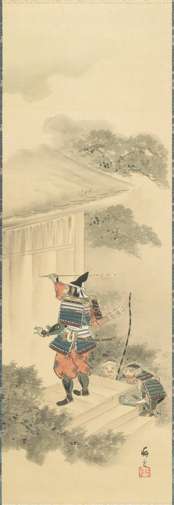 Masatsura was a fourteenth century warrior whose father Kusunoki no Masashige was killed while defending the legitimate emperor Go Daigo. After the emperor’s death, his son Go Murakami ascended to the throne, and Masatsura, then fourteen years old, joined the struggle to support his legitimacy. Masatsura’s successes in defending the emperor against his enemies earned the favor of Go Murakami, but angered his foe Takauji, who sent 60,000 troops to crush Masatsura’s 3000 warriors. Before the battle, Masatsura and a group of his men visited the tomb of Go Daigo and there swore to fight to the death, carving their names on the tomb. Using the point of an arrow Masatsura inscribed a poem on the temple wall indicating that in case he did not return, his name would be recorded among others killed in defense of the emperor. During the battle Masatsura and his men were overwhelmed, he was fatally wounded, and he committed seppuku along with his brother and cousin. Afterwards, the victors burned Go Murakami’s palace, but the emperor managed to escape.